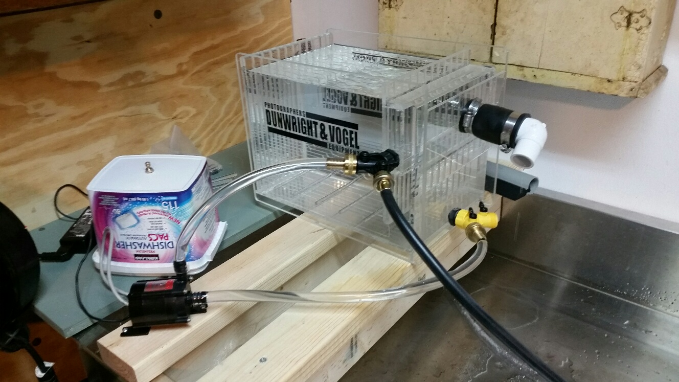 Phase one. Pump to circulate water. Next step set up a dump and refill setup. Idea is to run 3 , 5 gallon washes rather than 1 gallon a minute for 45 minutes, Thoughts? Dump water goes to pre rinse prints before putting in washer. Mag drive pump from a Noritsu processor. Kinda thinking a gas burst agitation might be cool too.