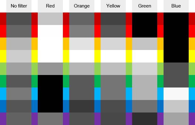 What the above chart basically shows is that for B&W film, filters lighten their own color relative to the colors opposite of them. Yellow, red and orange filters will darken blues more than other colors. So think colors, not objects or things like the sky. A red filter will do nothing for a cloud-filled sky (no blue sky showing to darken).