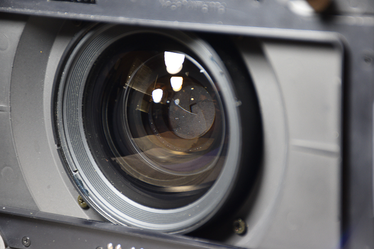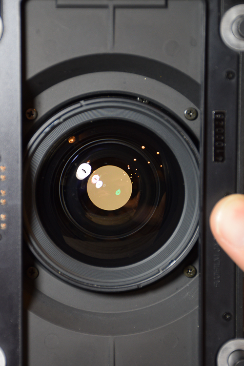 1) The lens has slight schneideritis which is extremely common in these lenses. No impact on photos.