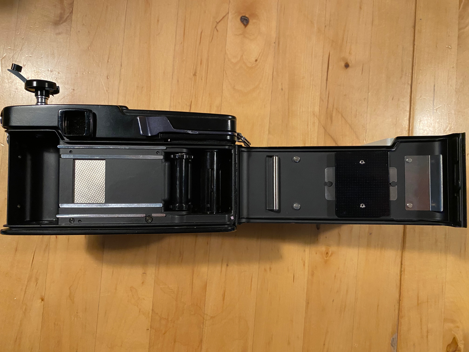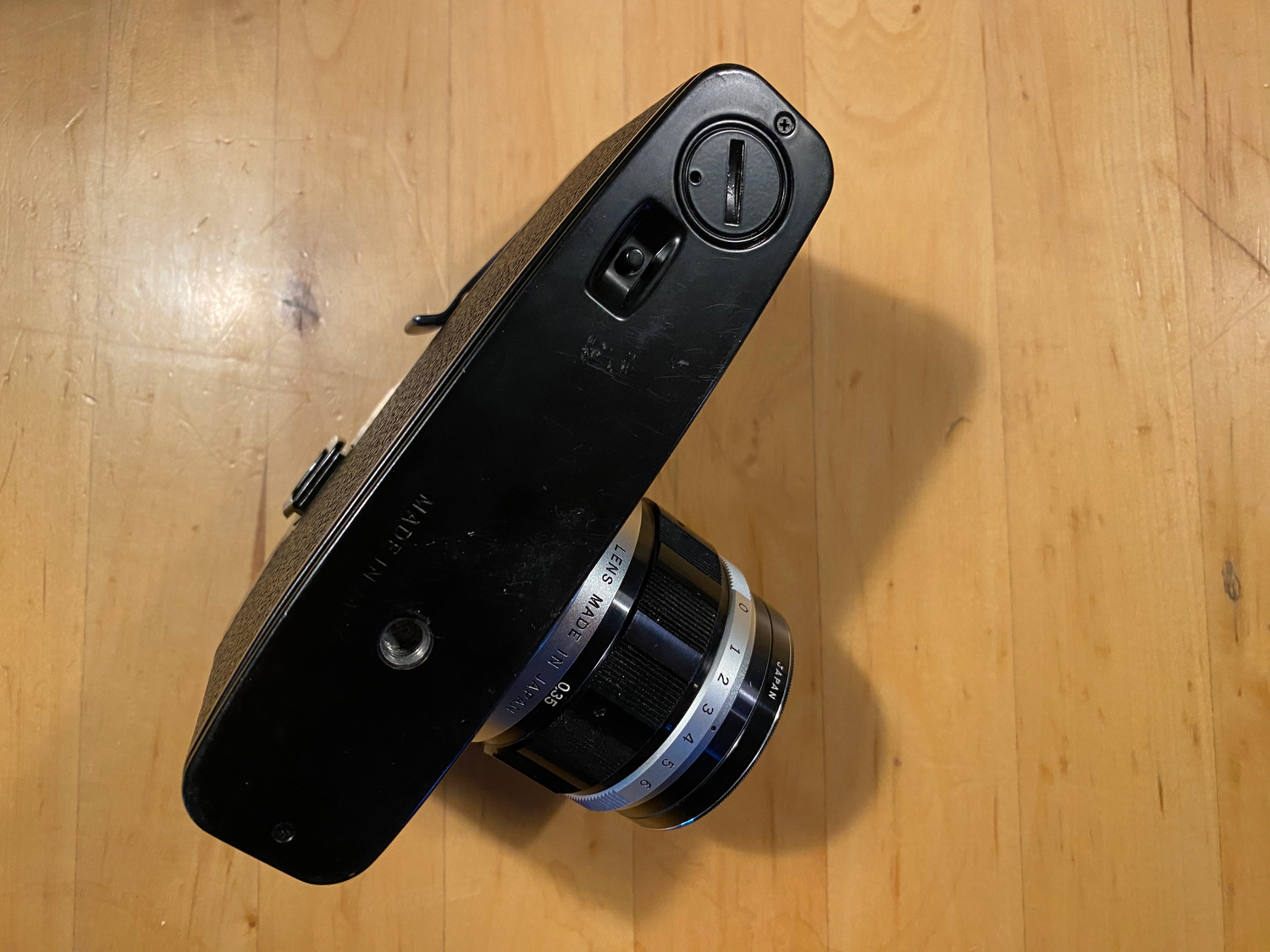 The body is lovely, with minor signs of use. Advance is good, viewfinder clear, mirror is clean, and shutter accurate. The ergonomics of this thing is perfect.