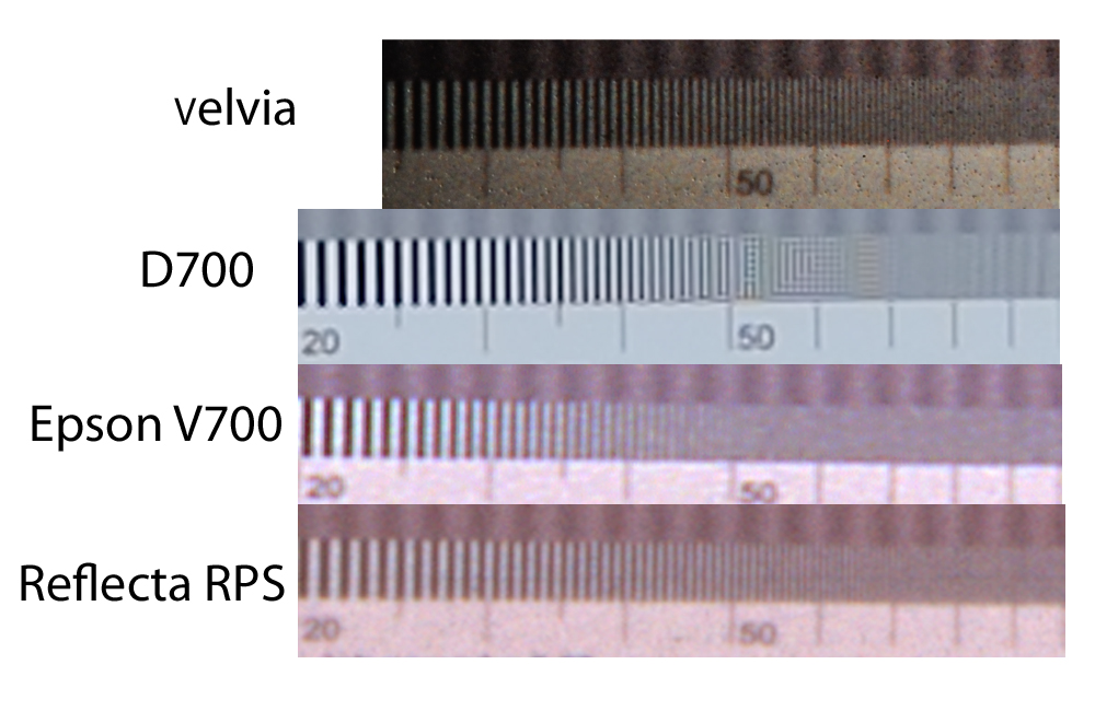 I had the Velvia processed and then scanned it at 7200 dpi (max optical resolution) on a Reflecta RPS and also at 6400 dpi on an Epson V700, both in Silverfast. There was a small amount of sharpening applied but this didn't affect the readings at all. I then look a close-up of the Velvia using the D700 on an Olympus bellows set with a Zuiko 20mm macro lens, giving about 12x magnification. The readings in line pairs per mm should be about right for this test chart and distance. Even if not, they allow comparison of like for like.