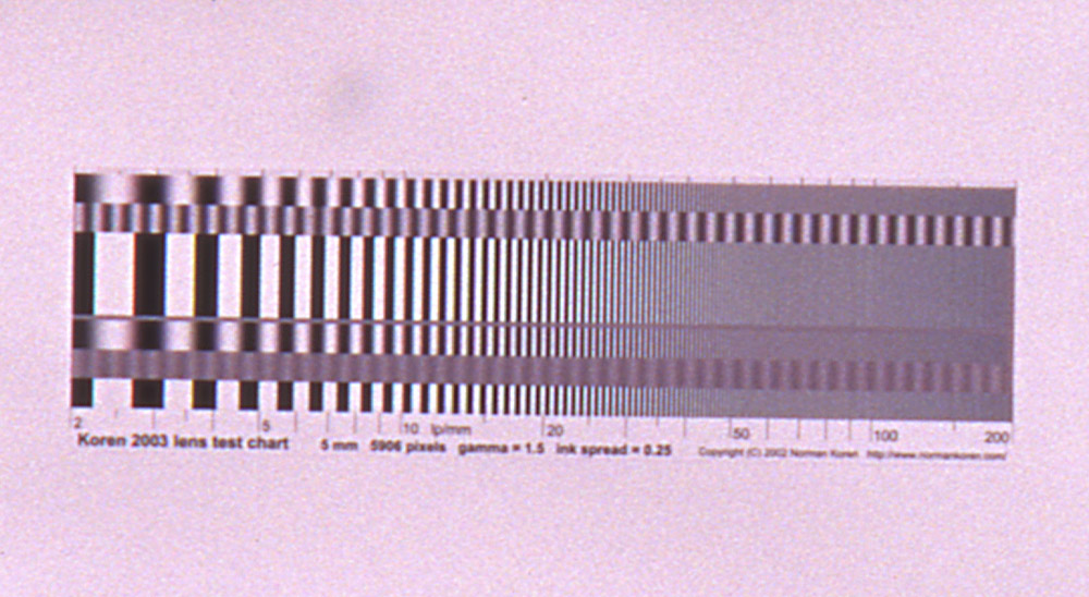 1. Velvia down a microscope (Olympus). I can see easily down to 90 lp/mm. You can just about see this on the full close-up taken down the bellows - don't worry about the spots here, it was on a piece of Perspex that had a funny texture. I think this is not too far from the theoretical resolution of Velvia. At a push I'd say you can see up to 95 lp/mm on the transparency.