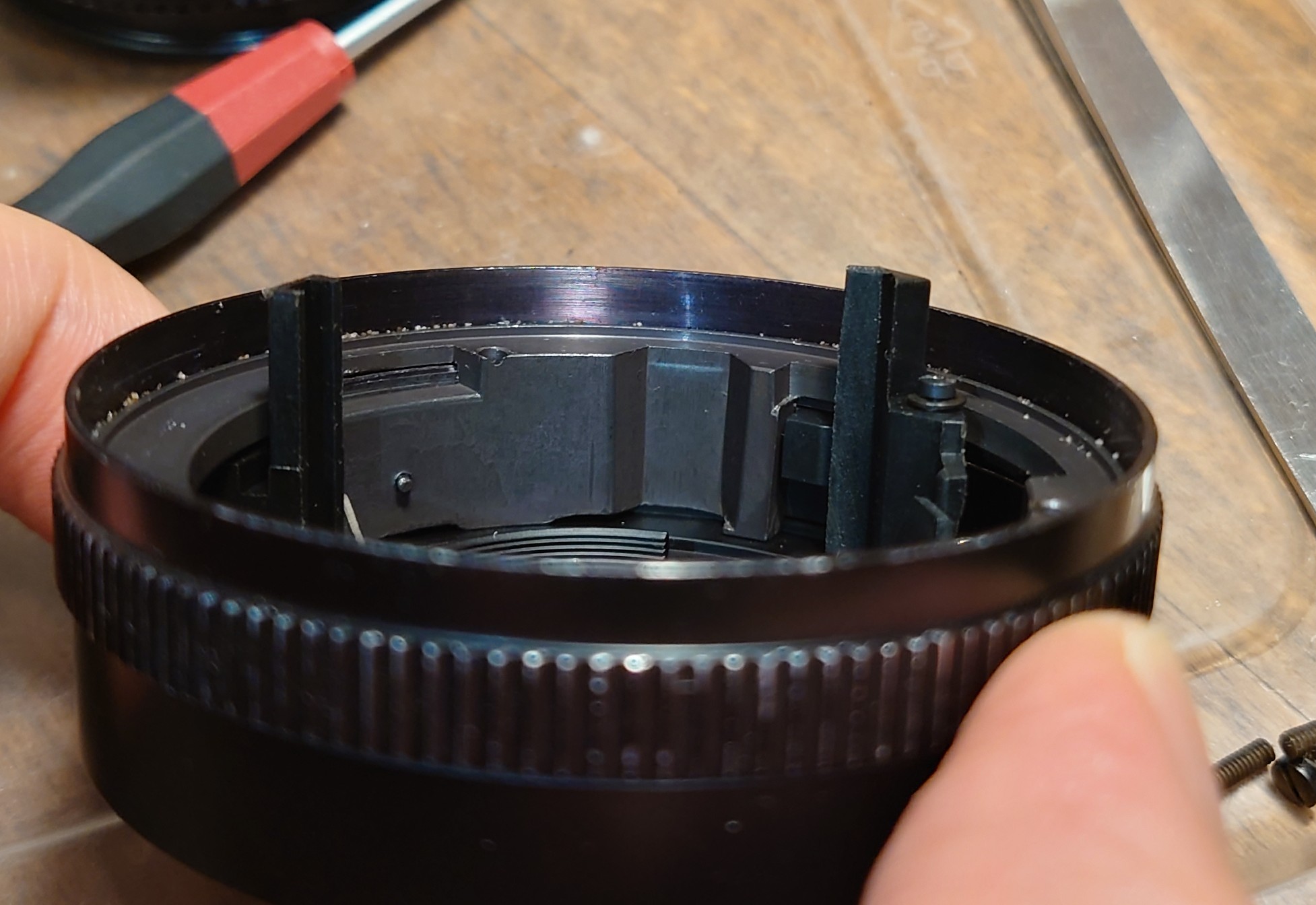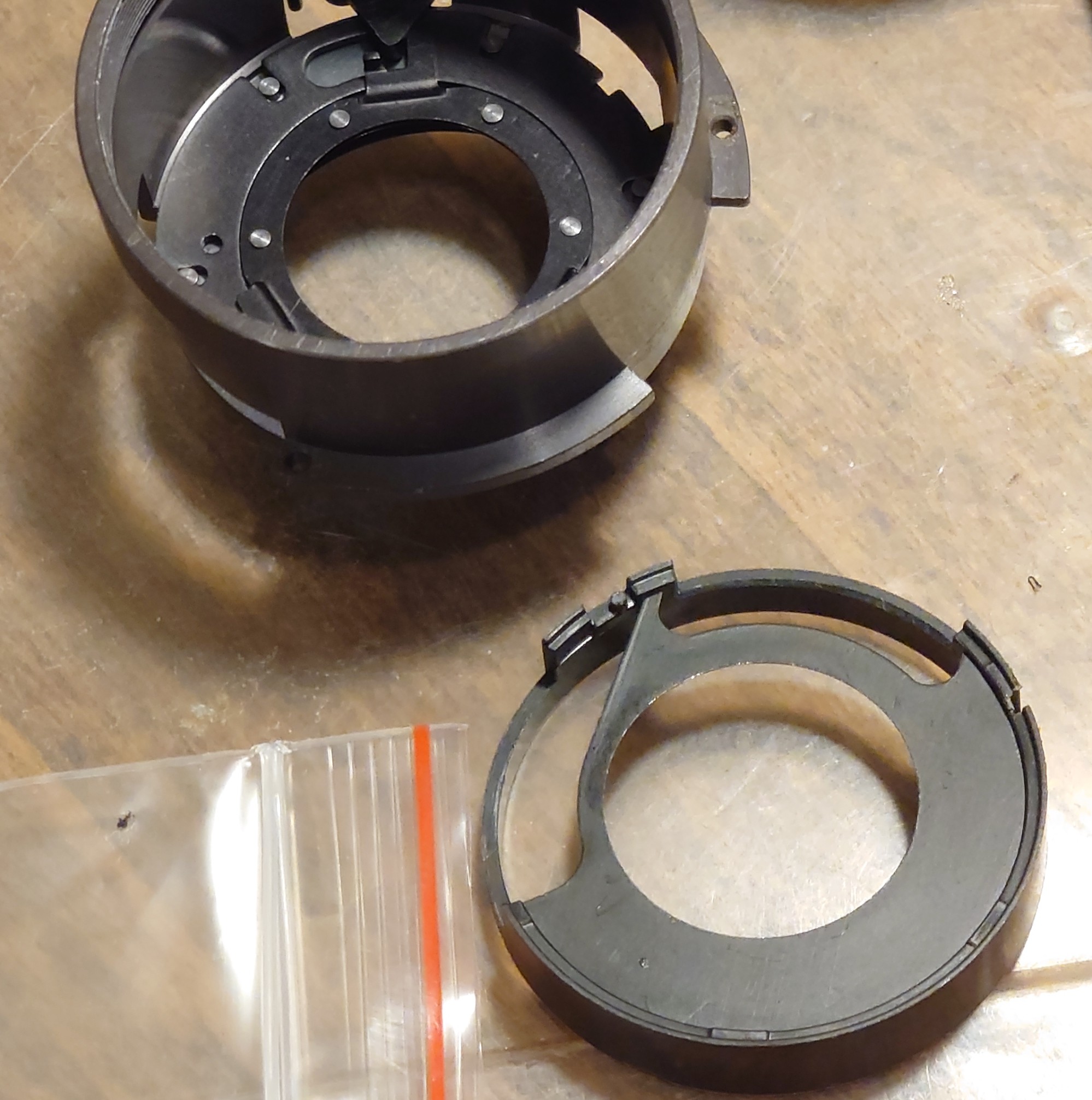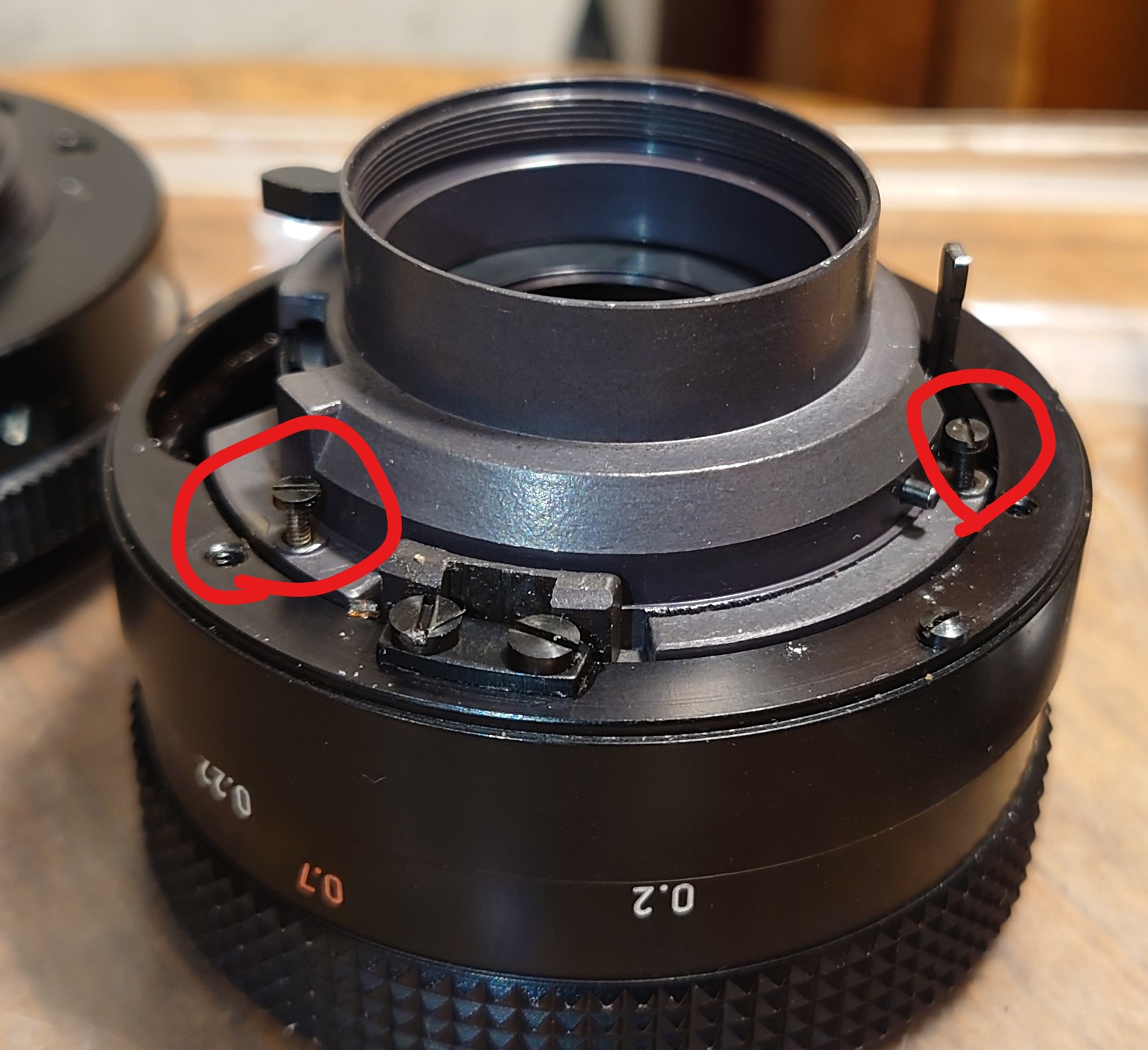 The you can put on the Ap size selector ring (not pictured) , re-assemble the metal lever with 2 screws , which are intended for connecting external Ap selector (fluted plastic part previously mentioned)