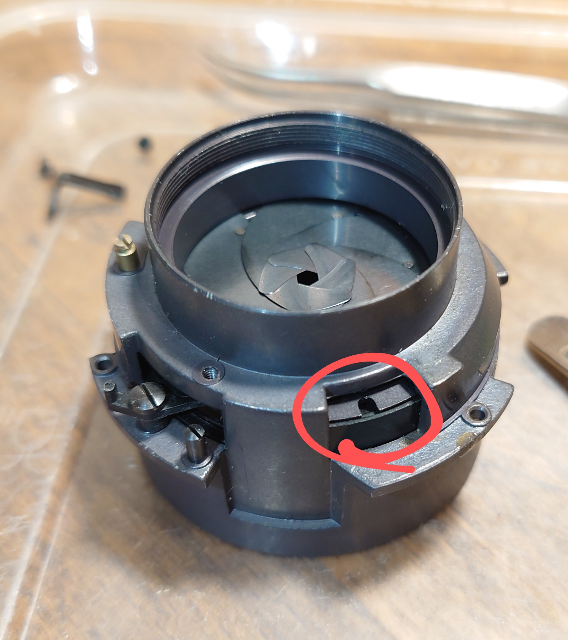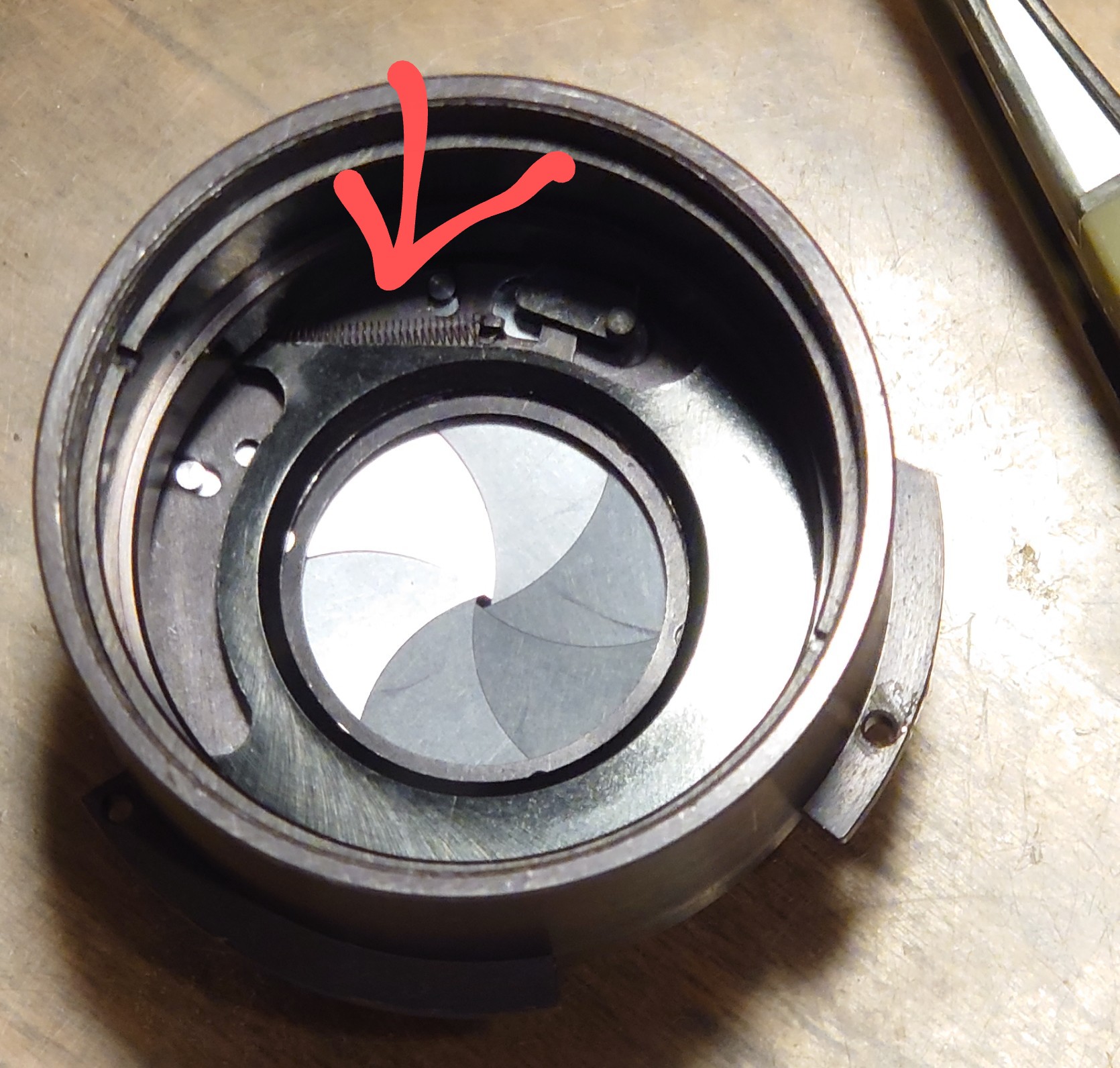 (fig 6)There is a gap on the barrel holder , and when you further dissembled the large Ap blades holding ring has a small+shorter cut. This cut belongs to here, and helps you to adjust the largest Ap size in opening.