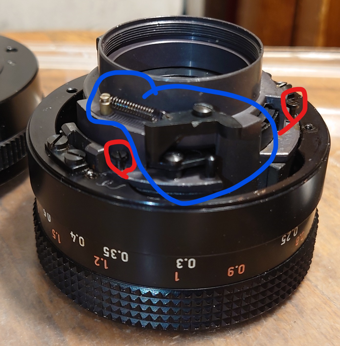 The you can put on the Ap size selector ring (not pictured) , re-assemble the metal lever with 2 screws , which are intended for connecting external Ap selector (fluted plastic part previously mentioned)