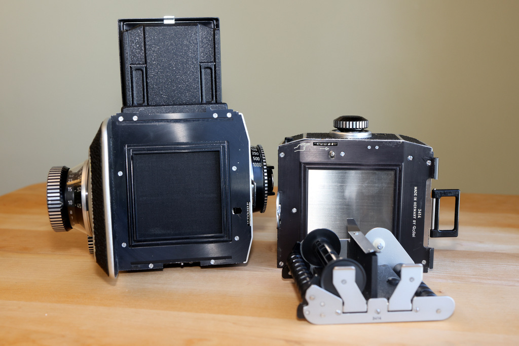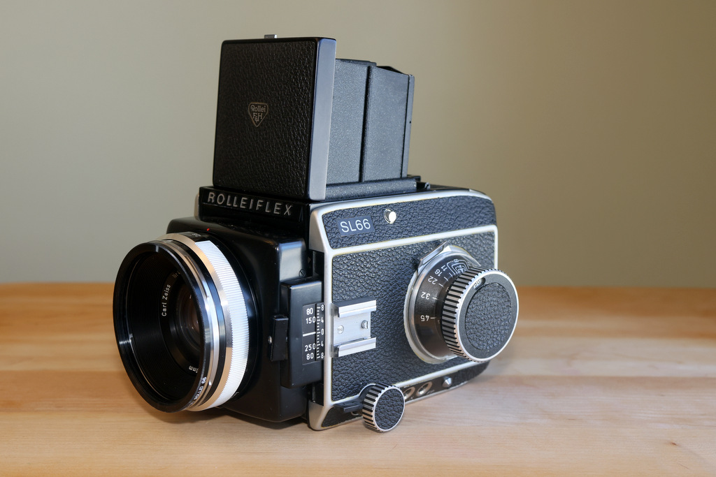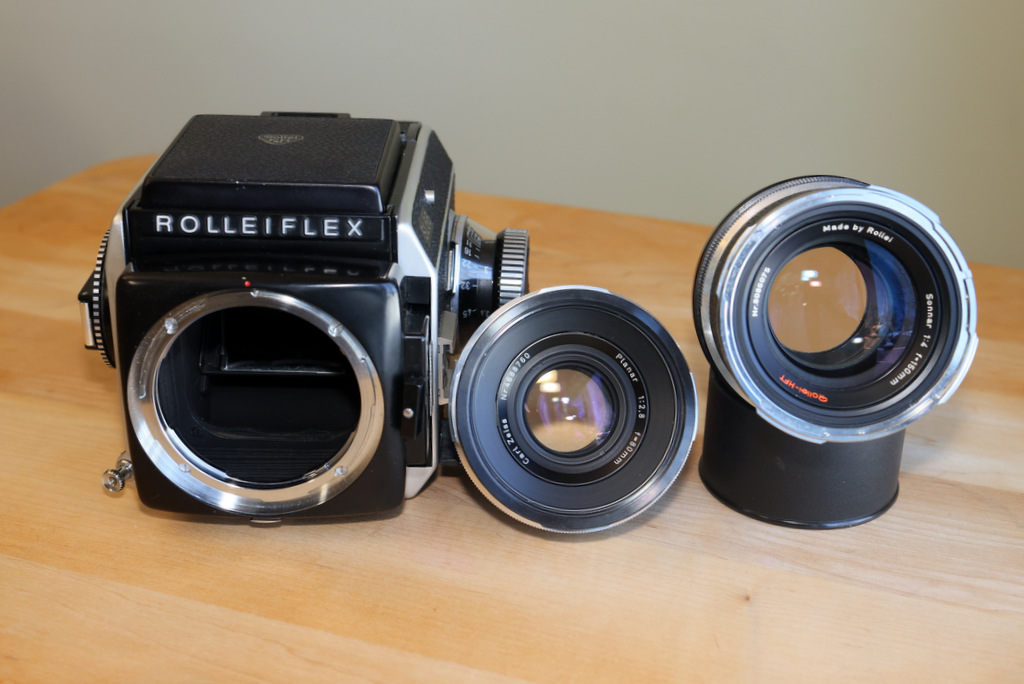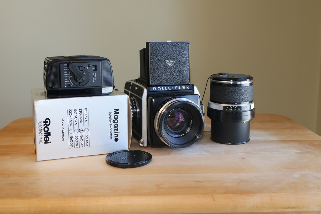 A very nice Rollei SL66 kit that's in very good condition as you can see. The only problems I have found is the focusing grease is probably dried and is a little stiff focusing and the flash doesn't work on 1/30 of a second but fires at lower speeds. The lens tilt works fine up and down. The extra back is a newer 220 back but have been told it will work on this model but you need to stop at 11 exposures. I never used the back, but I have dry fired it with no problems. The lenses look good with maybe some dust. Not totally convinced I want to sell it yet but I have my eye on a couple of digital lenses that I will use a lot more than this.