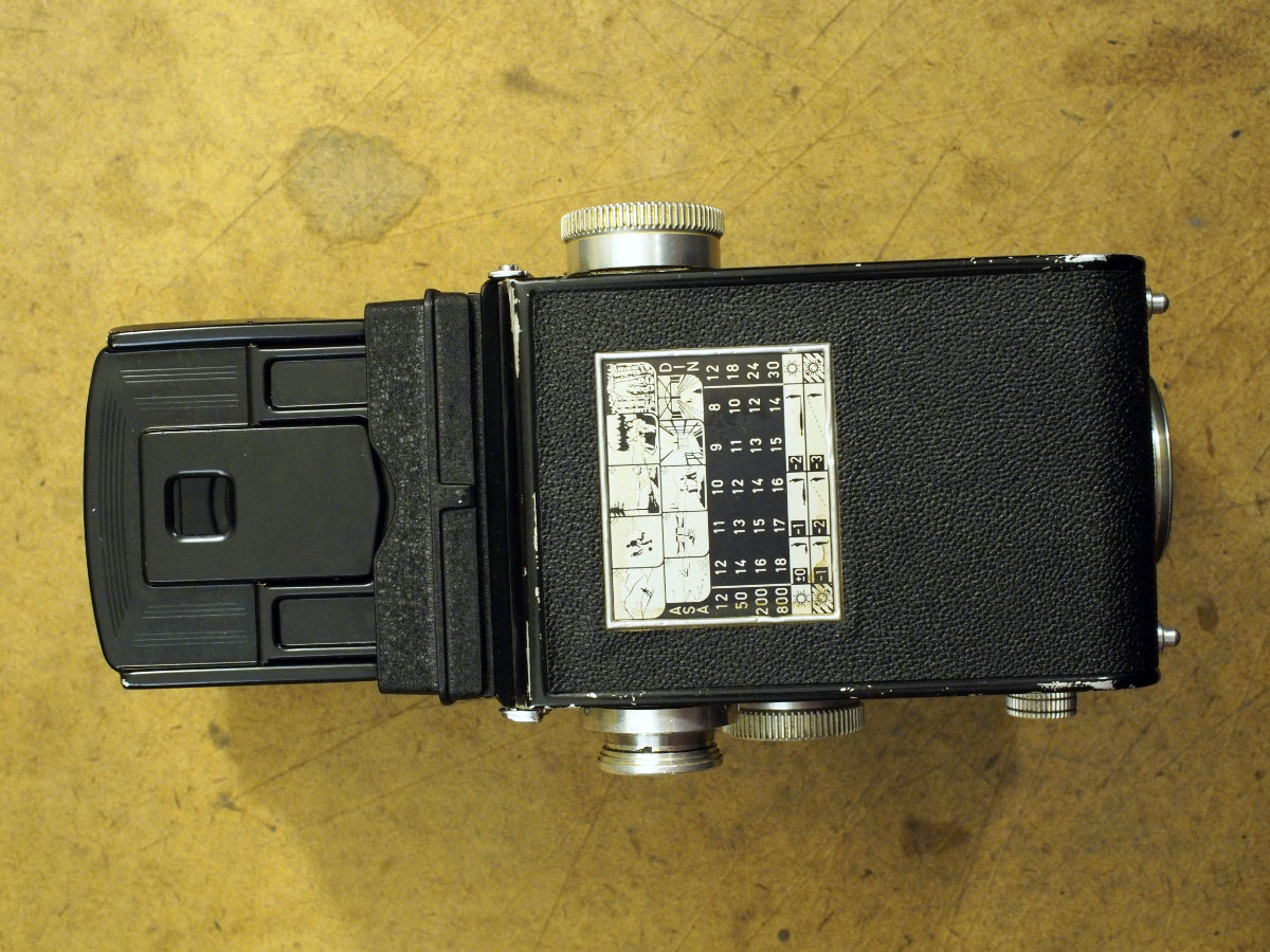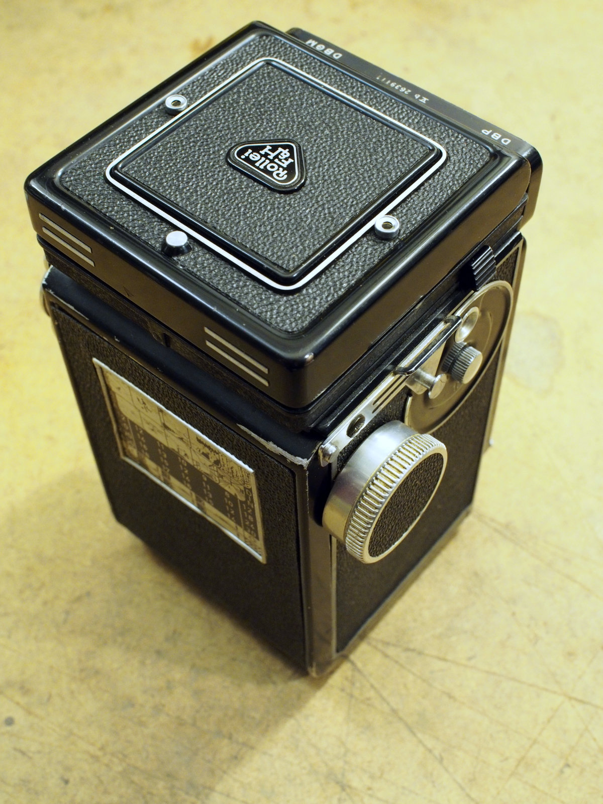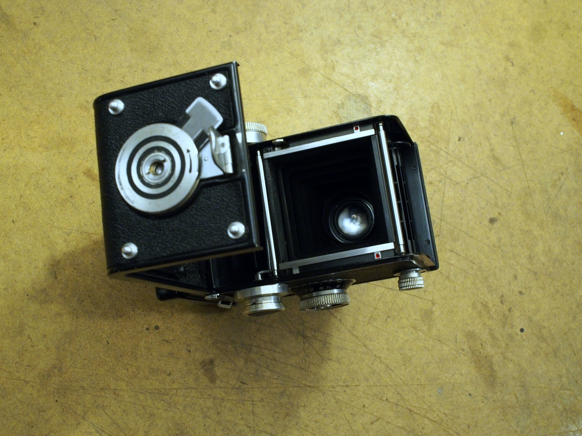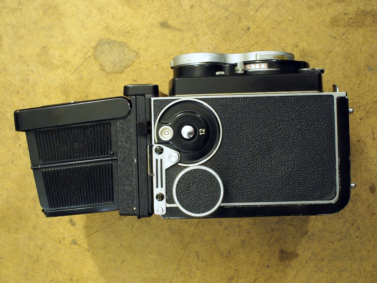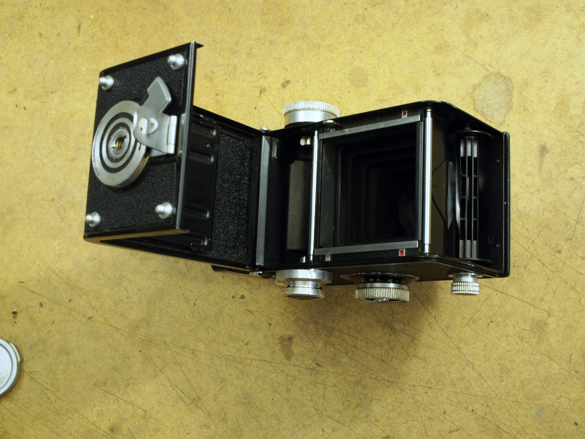 (I bought this camera on EBay because it had a Rolleiflex focus hood installed, with the drop down mirror for focusing when using the sports finder. Now this camera has an original Rolleicord Vb focus hood and I am selling it on after checking it out)