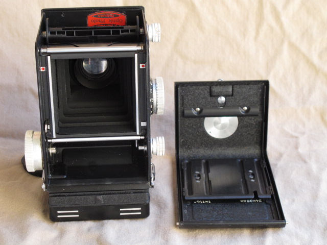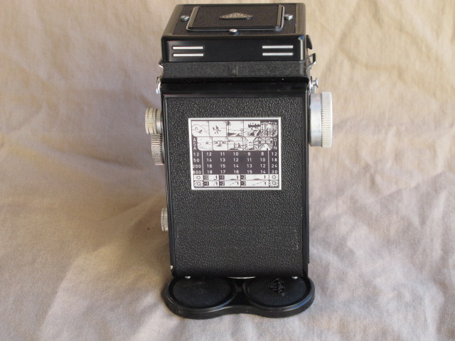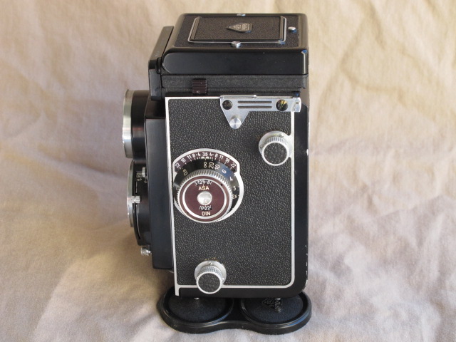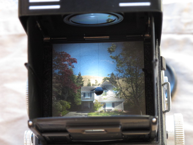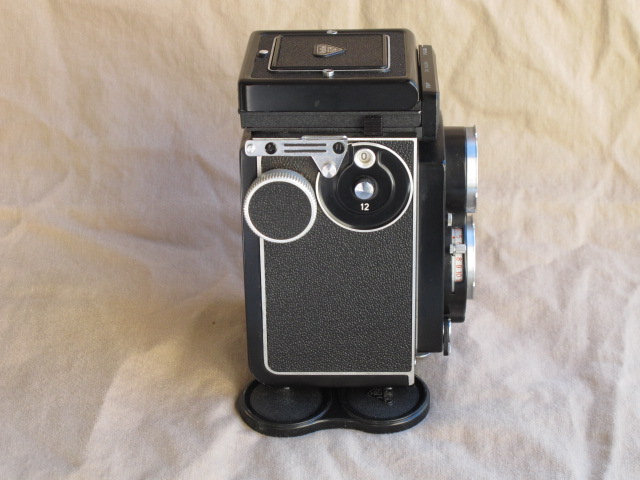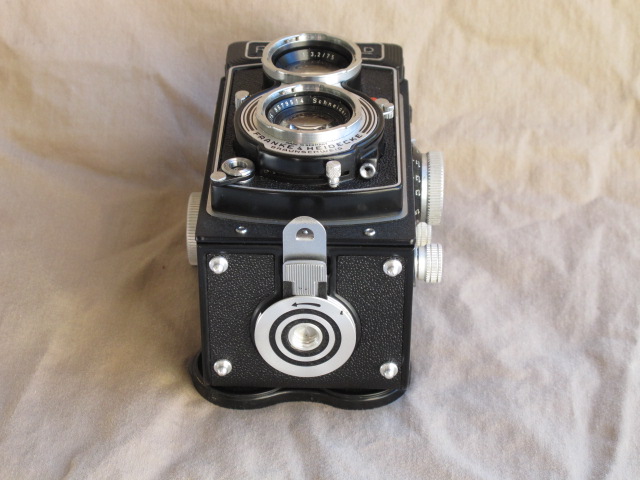 This one is in very nice user condition, with a few small areas of finish loss or dullness, but no dents or dings. The glass in both taking and viewing lenses is clean and clear, free of haze, cleaning marks, scratches or other blemishes. While I have no paperwork documenting a CLA, this camera came to me (from Igor's Camera Exchange) with the claim of a recent CLA. All functions are smooth, including transport and focusing, and the shutter and self-timer all run strong. The focusing screen is a standard Rollei screen with a rangefinder spot in the center surrounded by a very fine Fresnel lens. The latter is bright to the edges and is fine enough to focus easily if you don't use the split image spot.
