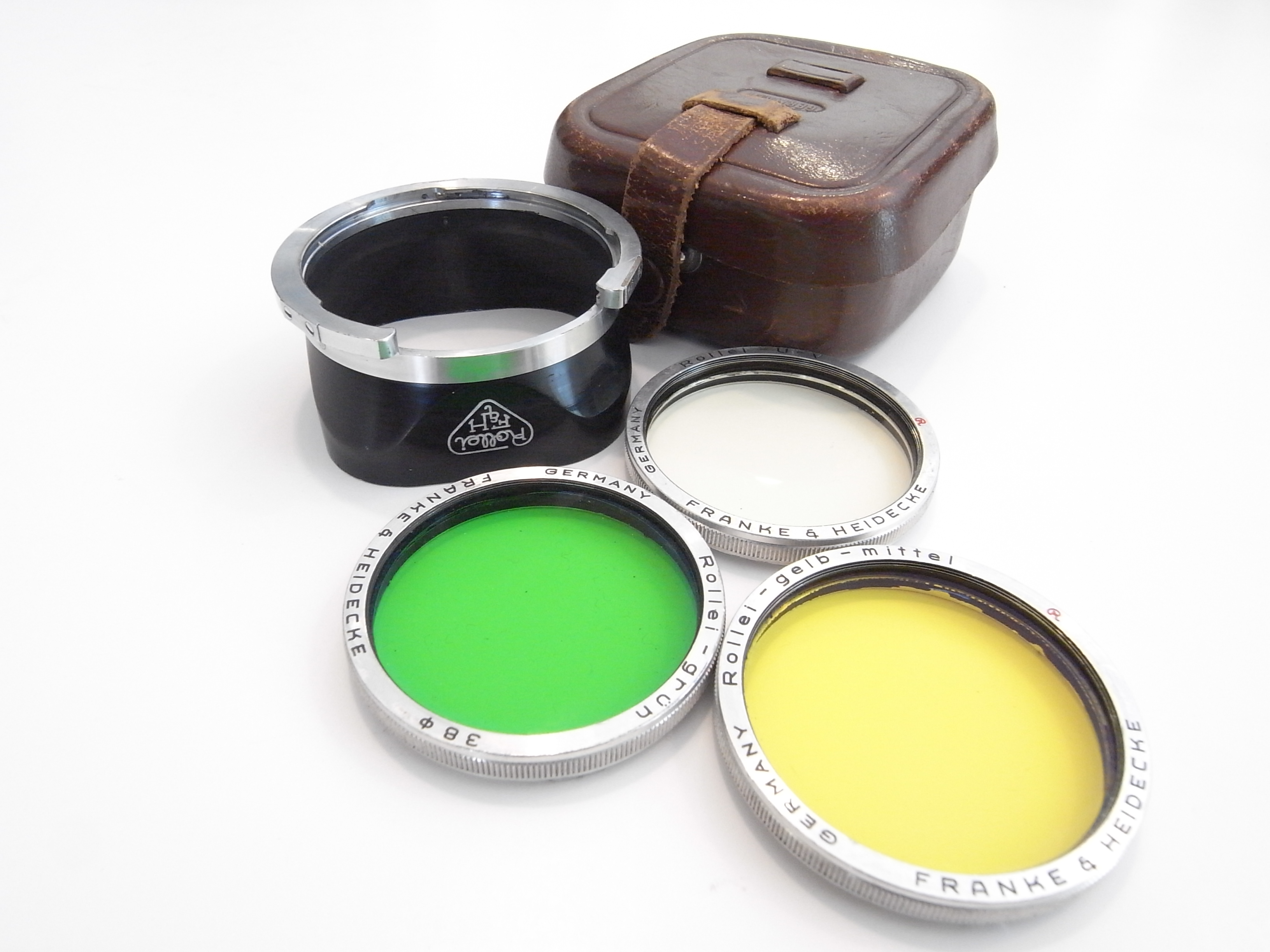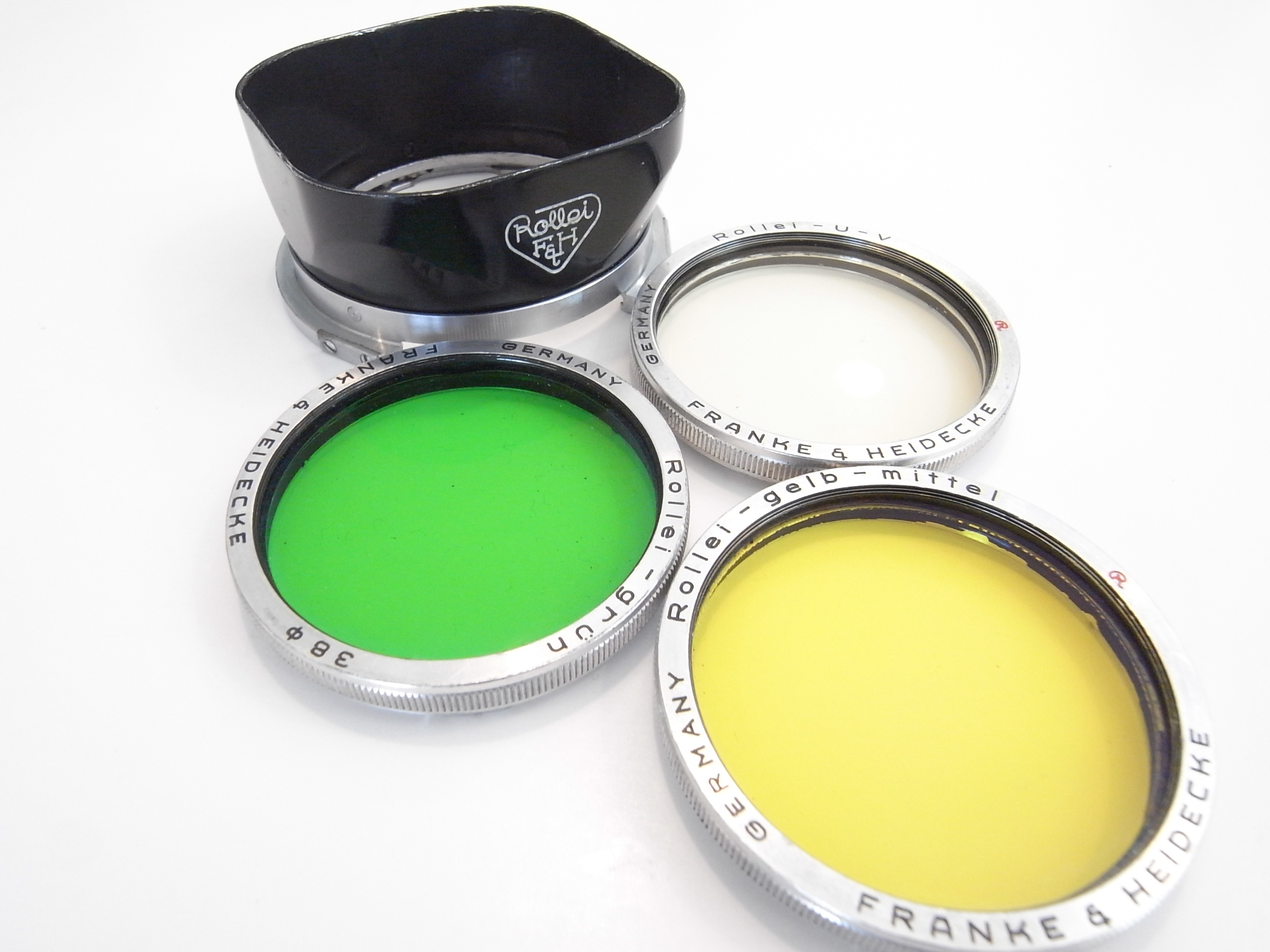 2. Rolleiflex bay III hood and 3 filter set in case. Excellent minus condition. Some very slight marks on filters and hood edge. $200.00
