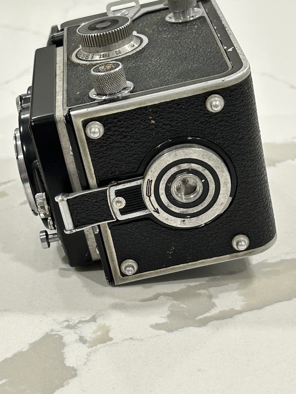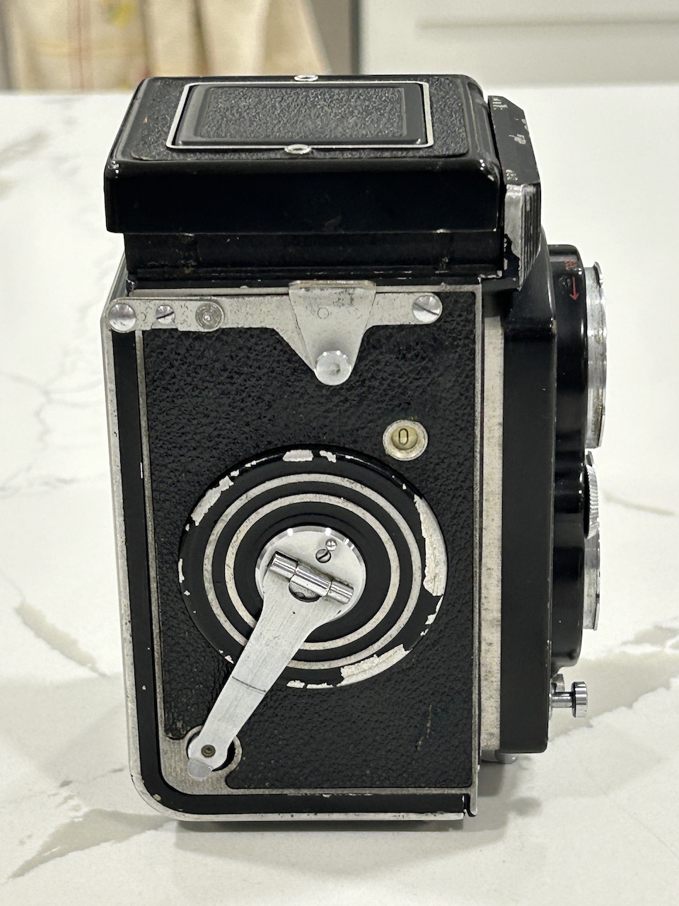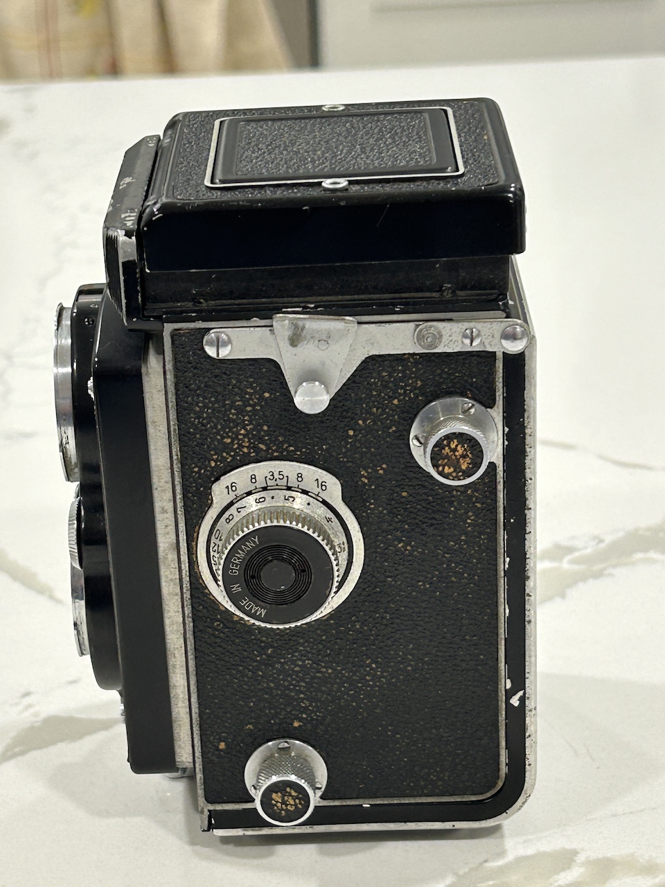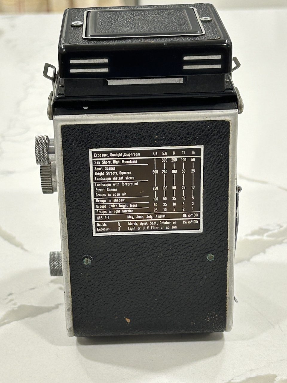 The taking lens is clear and clean with no internal problems and at worst, a few negligible micro cleaning marks. The condition is notably better than most vintage Rolleiflexes actually. One reason is that I had it professionally cleaned recently. The mechanical controls are smooth and normal. The hood opens and closes normally and the magnifier works as expected. The image on the viewing screen is normally bright for a Rolleiflex of this era (which means fairly dim, but certainly workable!). The shutter fires at all speeds and sounds right except 1 sec and 1/2 sec, which seem about like 2 sec and 1 sec, respectively. Before me the camera was owned by a working photojournalist who apparently took care of it as there are no signs of mistreatment.