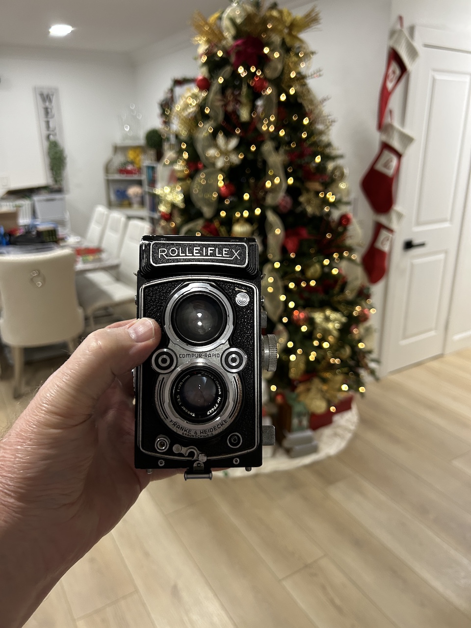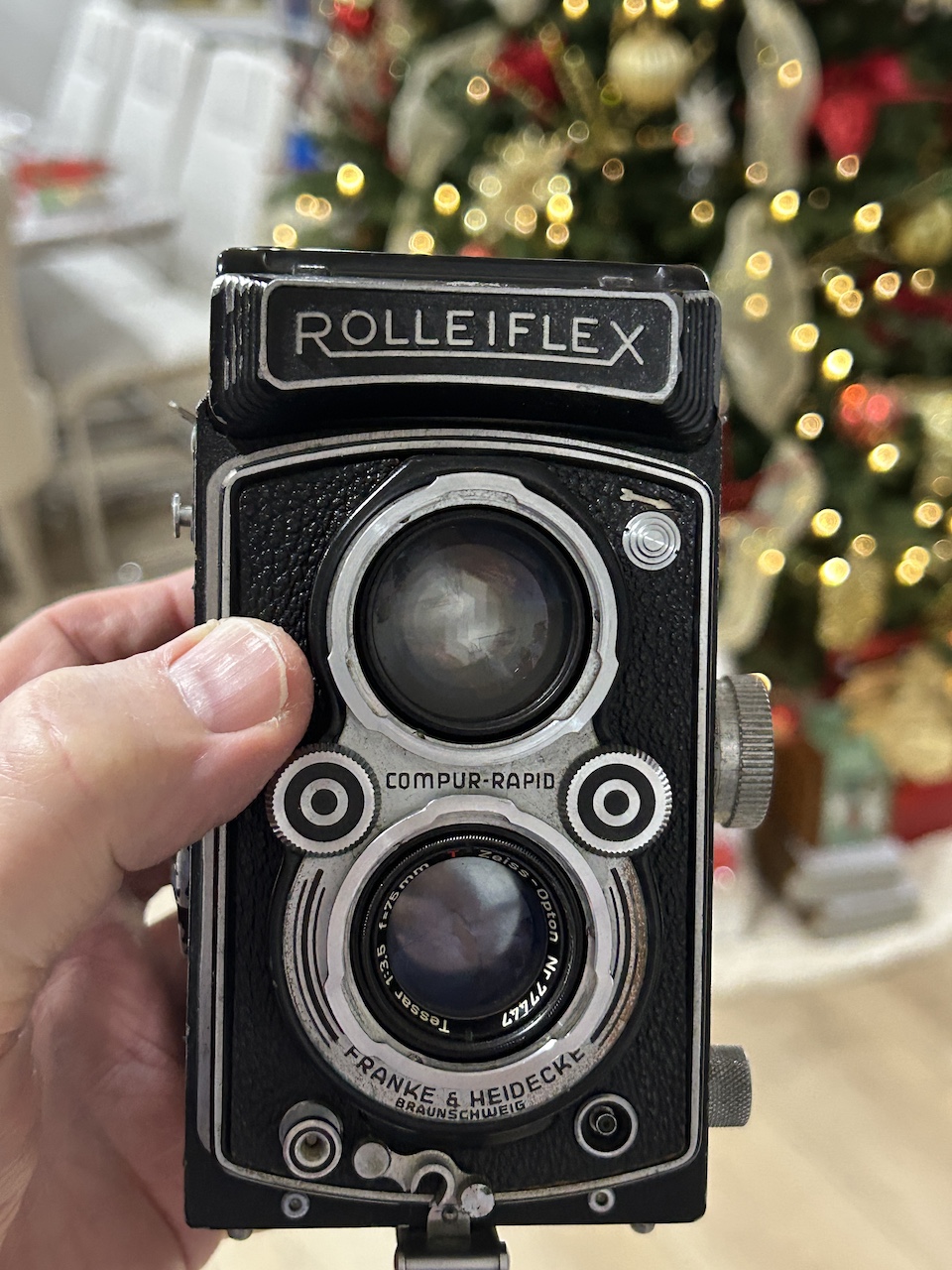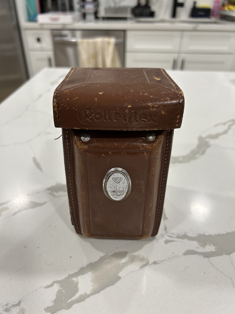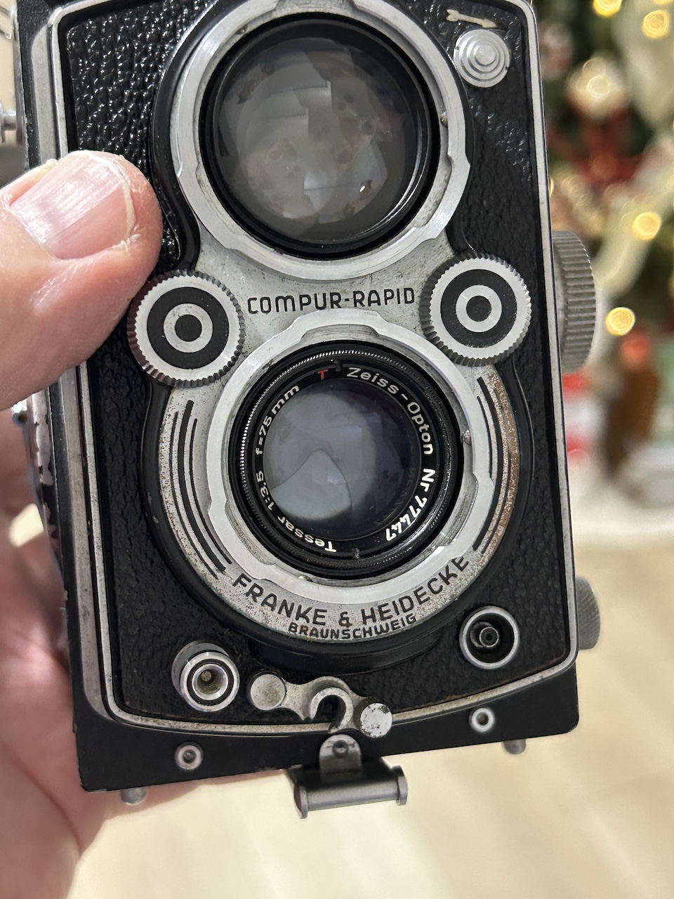 The taking lens is clear and clean with no internal problems and at worst, a few negligible micro cleaning marks. The condition is notably better than most vintage Rolleiflexes actually. One reason is that I had it professionally cleaned recently. The mechanical controls are smooth and normal. The hood opens and closes normally and the magnifier works as expected. The image on the viewing screen is normally bright for a Rolleiflex of this era (which means fairly dim, but certainly workable!). The shutter fires at all speeds and sounds right except 1 sec and 1/2 sec, which seem about like 2 sec and 1 sec, respectively. Before me the camera was owned by a working photojournalist who apparently took care of it as there are no signs of mistreatment.