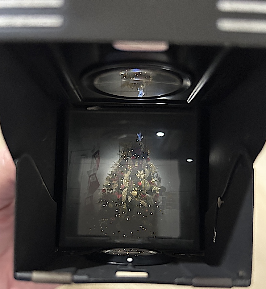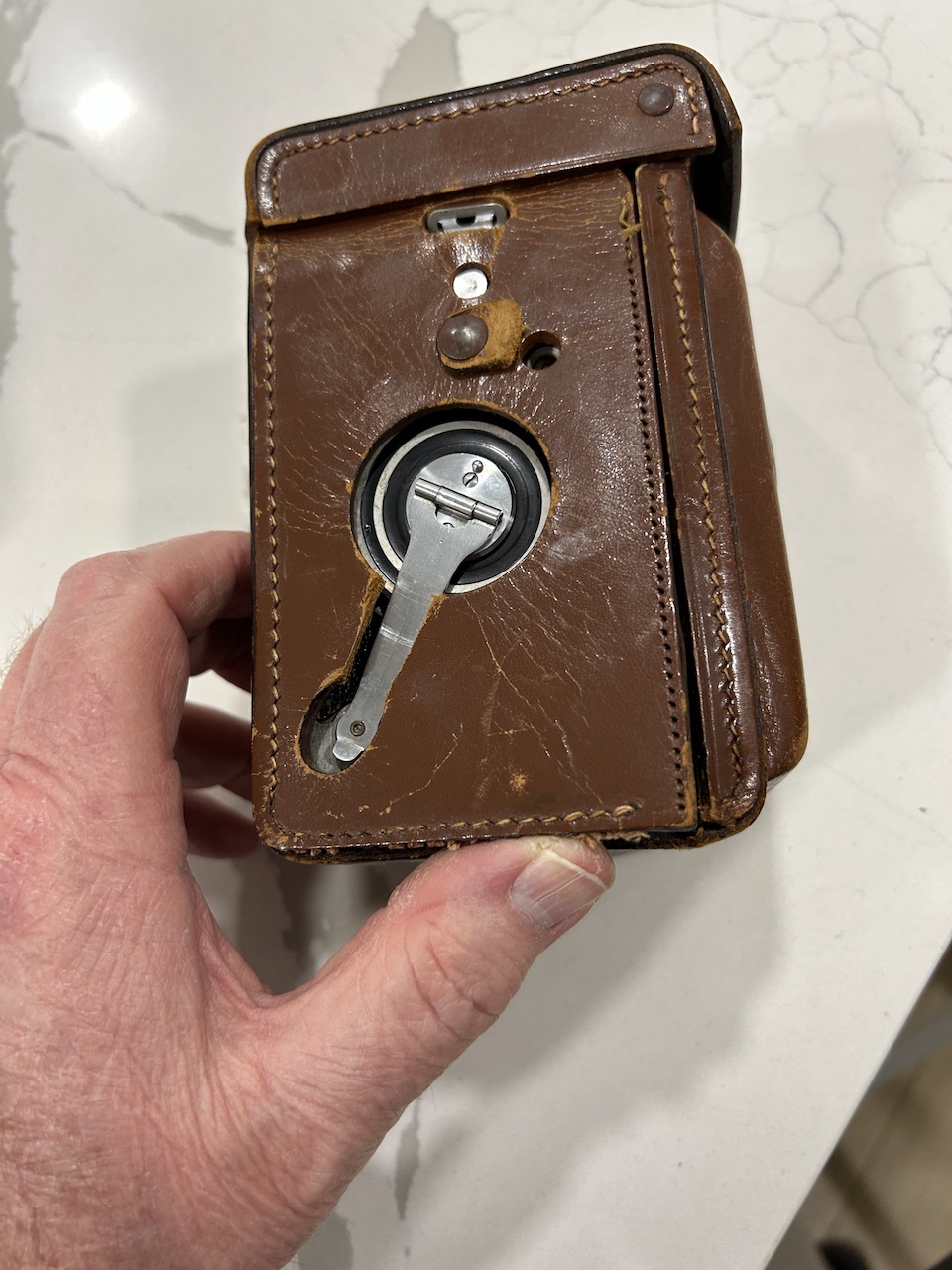The mirror has many dark spots on it and that are either debris or more likely, coating loss - not sure. Amazingly this has not really reduced the brightness of the image noticeably IMO. The focusing screen looks undamaged and without obvious dust, but as with all old Rolleiflexe, I'm sure it could use cleaning - it still does the job however! Replacement mirrors are commonly available as are newer, brighter focusing screens for those who want to trod that path (all at modest cost). The case has a lot of wear and is missing stitches on one side, but it still serves its main purpose of protecting the camera. There is paint chipping on some parts and the leatherette could use updating for cosmetic purposes, but everything is still intact. The camera had a slight cigarette smell. I wiped it lightly with some alcohol and that might clean that up, but a good airing should, in time anyway.