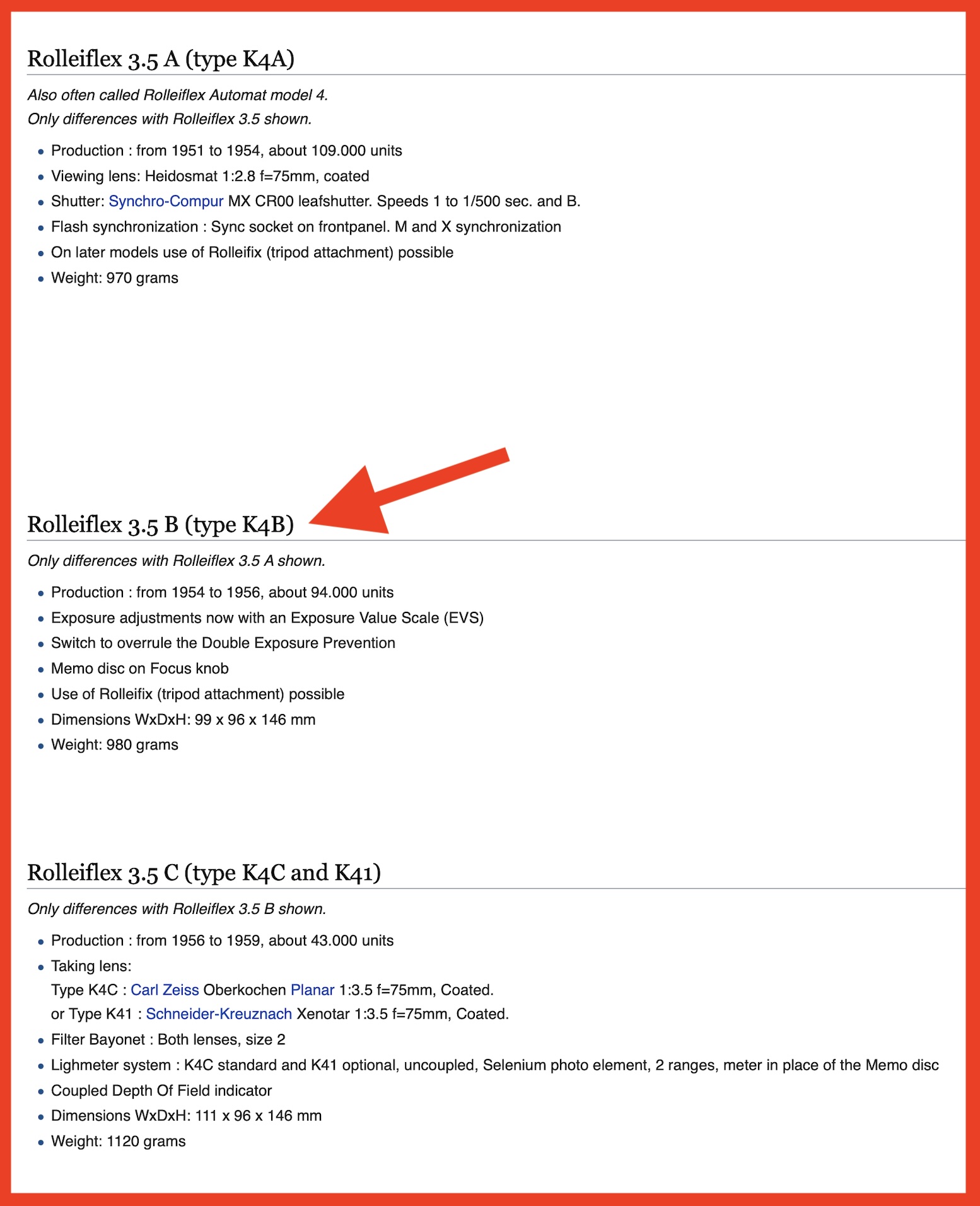 Whether we disagree is irrelevant. The number of current search results (53) returned for "Rolleiflex 3.5B" on eBay shows the camera buying/selling community is using this descriptor. And how is this not respecting the history?