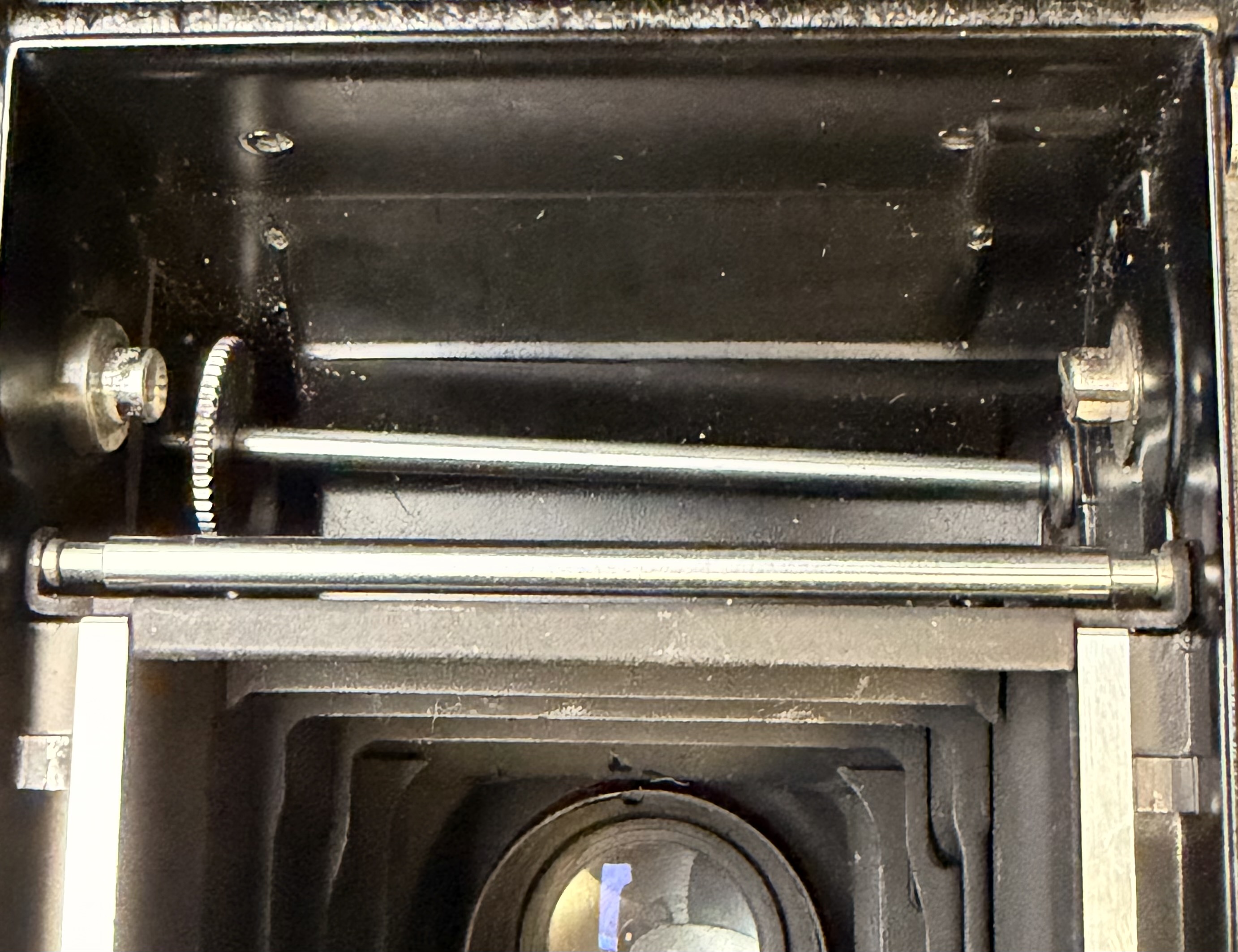 I mention this becasue it is possible for this axle to be set such that there is no registration of film movement at the beginning of the roll, sometimes into the first or second frame. But eventually the film and paper should add enough diameter tot he spool to start it rolling, and having the frame counter start moving. Very rare condition, but just to mention it.