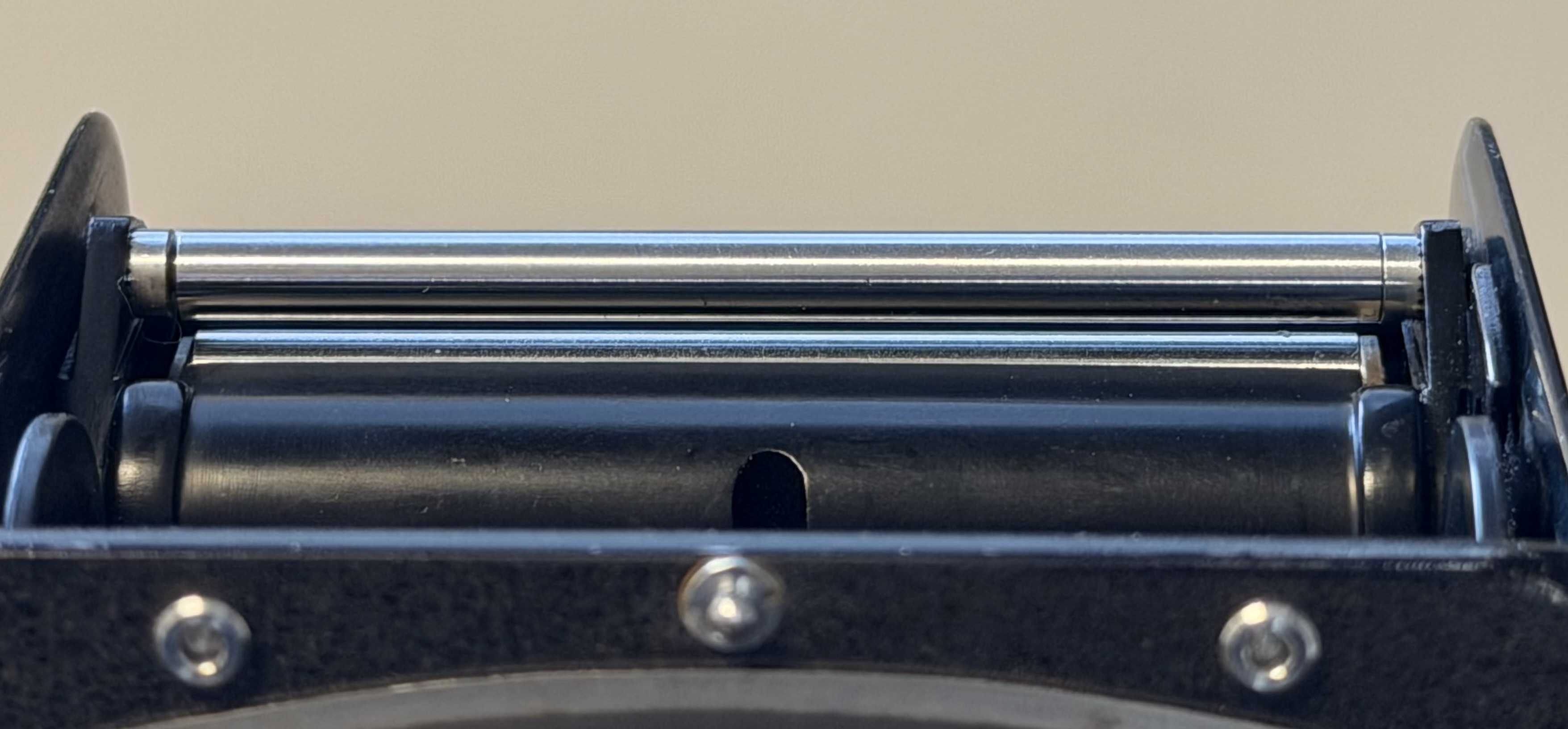 Second point- you can test the film sensor in one aspect of function by putting an index card, maybe doubled over, in between the two roller. Just building up thickness. Now move the black 'foot' that Flighter points to forward. In doing this, you might hear a clunk from inside the camera on the wind side. Move the foot (some pressure is fine, end of travel will be obvious) both with and without the index cards in between the rollers. Without material, no clunk, with material, clunk. Not super loud but can be heard.