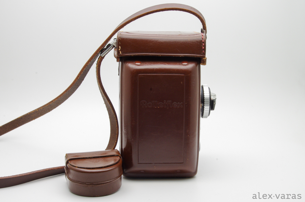 It comes with leather carry case, shade hood and its pouch, lens caps, new leather strap by a Italian brand and a Rolleinar II (not pictured, I found it later).