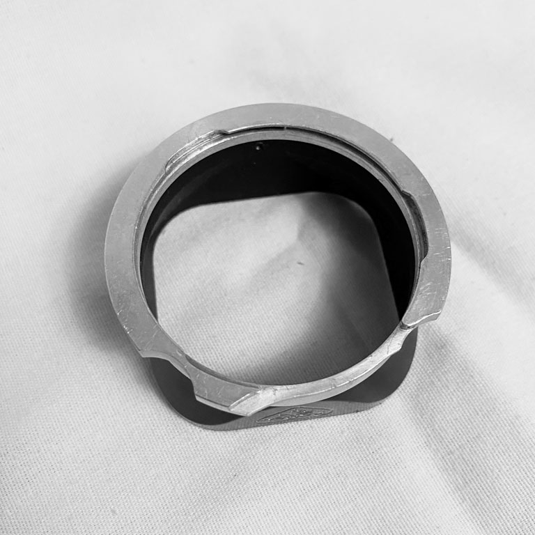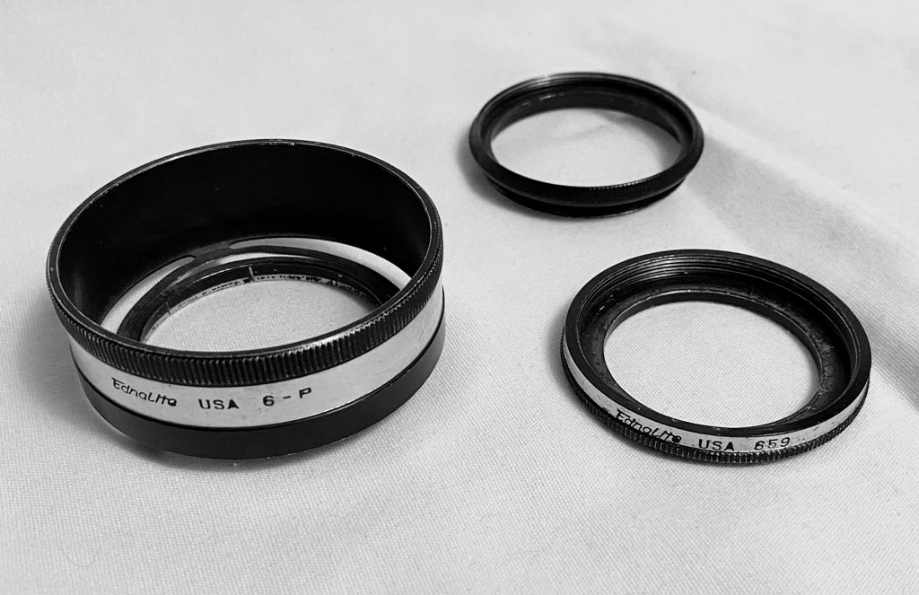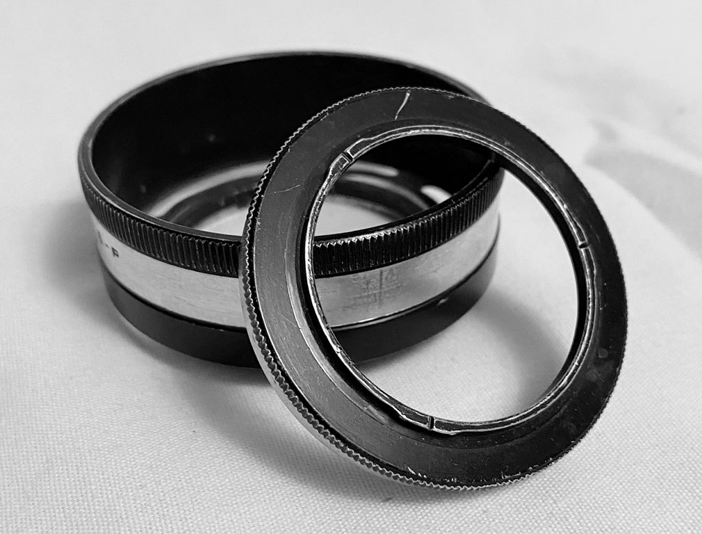 4) A Ednalight adaptor ring, Rolleiflex bayonet size 2 (R II) to Series VI, with a retaining ring and lens hood. The hood can serve as a retaining ring as well, $40.00; and