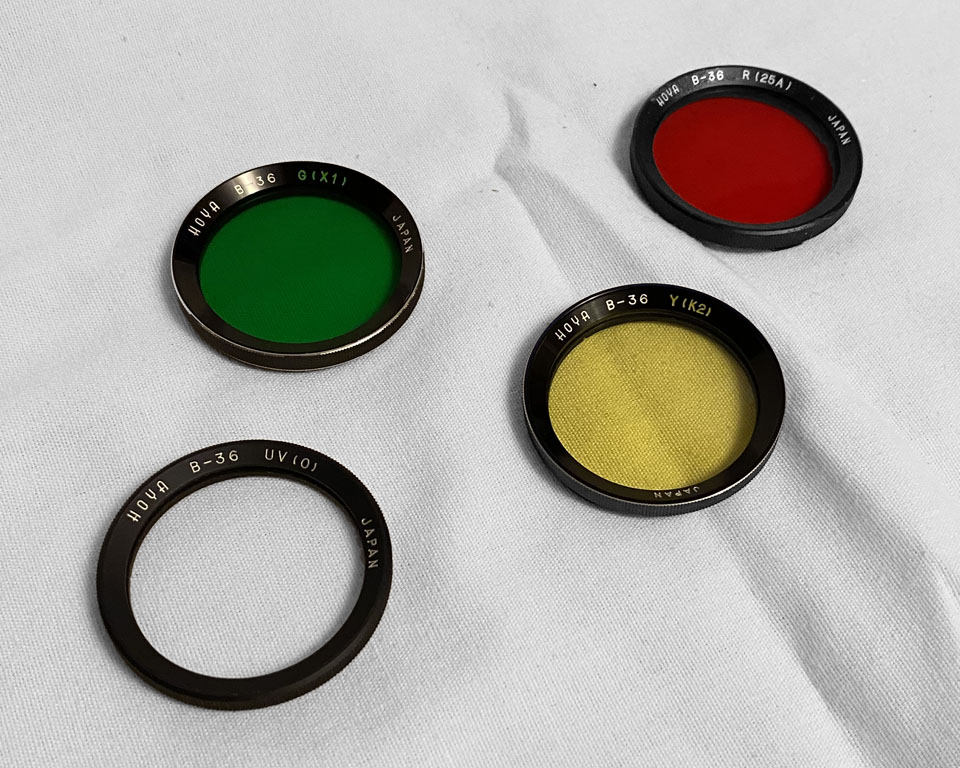 *SALE PENDING* 3) Four Hoya brand filters, Rolleiflex bayonet size 2 (R II), yellow Y(K2), green G(X1), red R(25A) and ultraviolet (UV(0), $100.00 for all four;