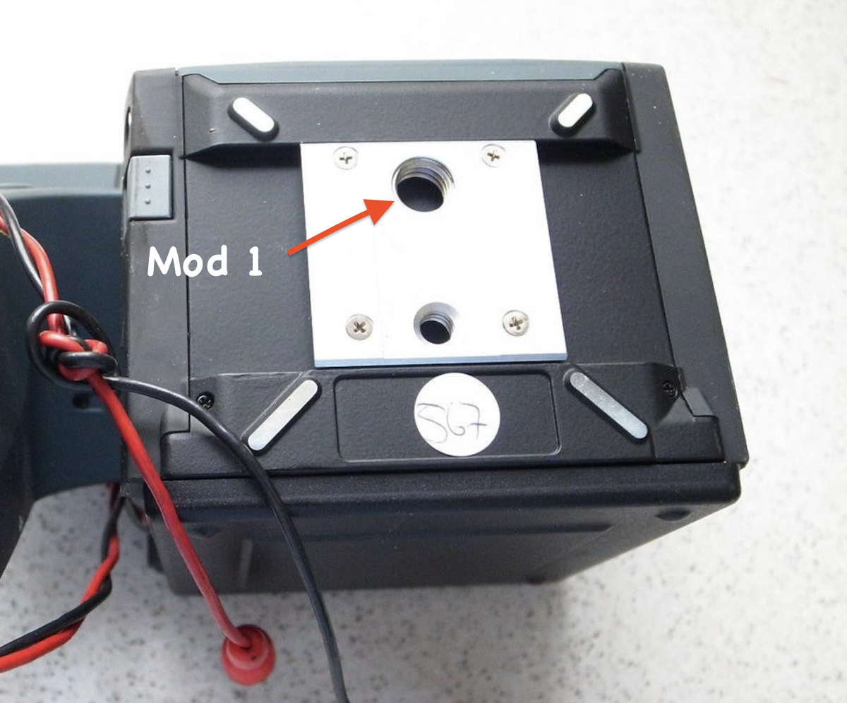 Mod 2 should have a thicker plate, not drilled all the way through, to protect the camera from a long tripod screw.