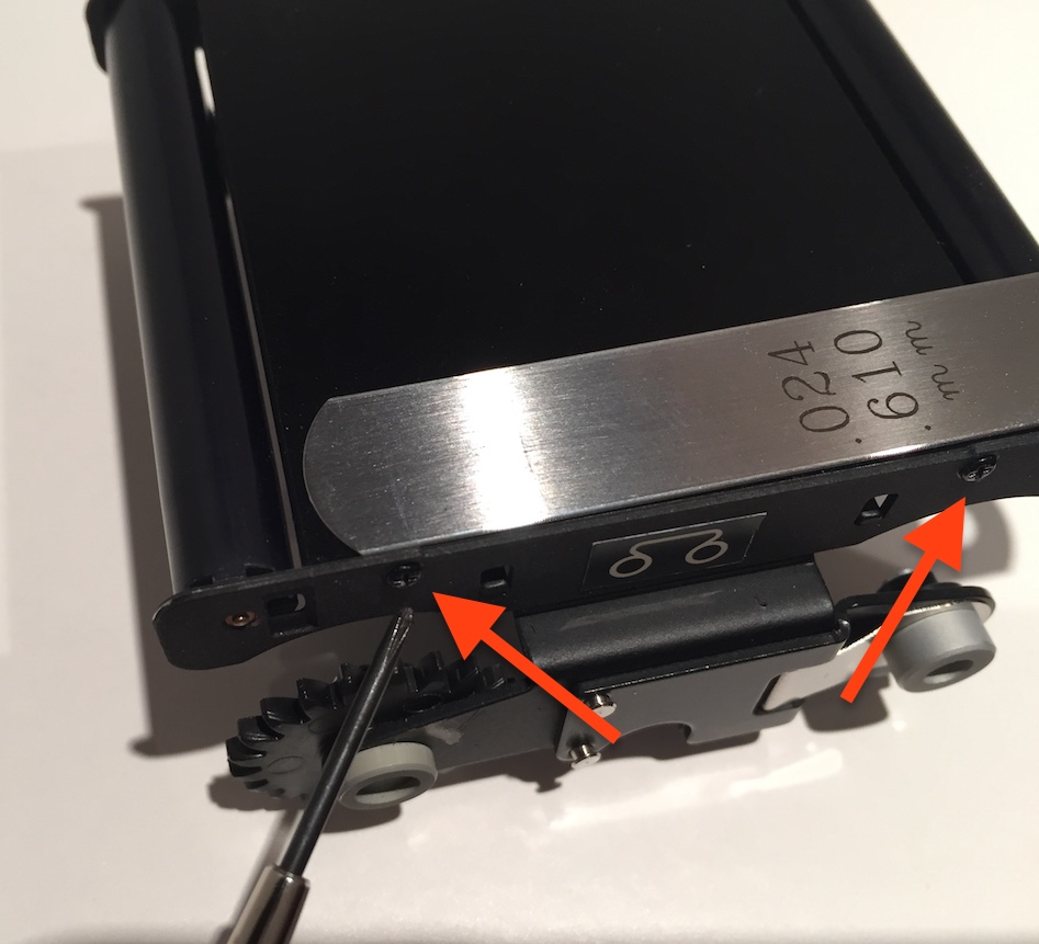 To understand the mechanism, the parallel rails on the camera side are both the same thickness, so the gap for the film is created by this little step-off just above the screw and arrow in the picture. This is different than just about every other pressure plate I have encountered. That step-up rides on the outer rail.