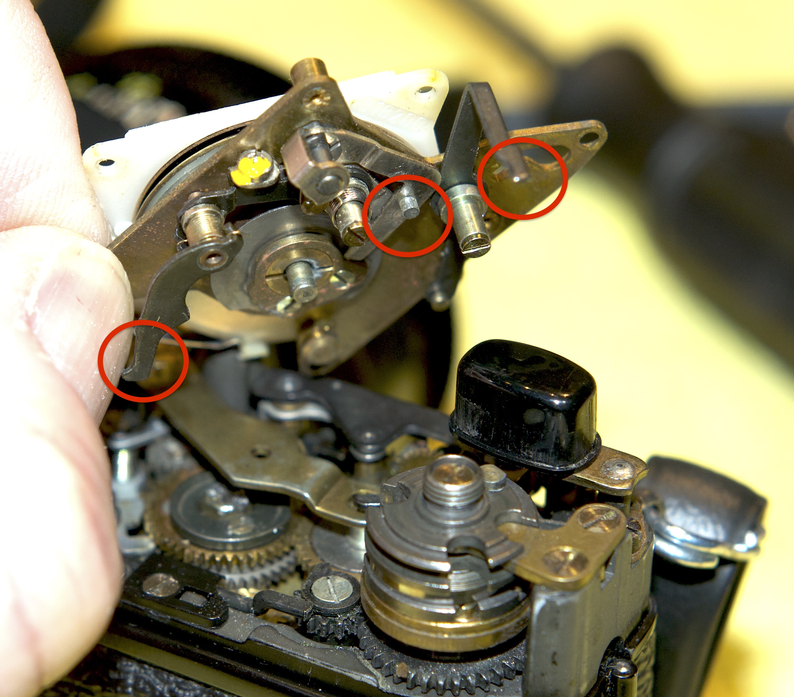 Underside of the speed setting cams showing the three levers that need to be in position when re-attaching the assembly.