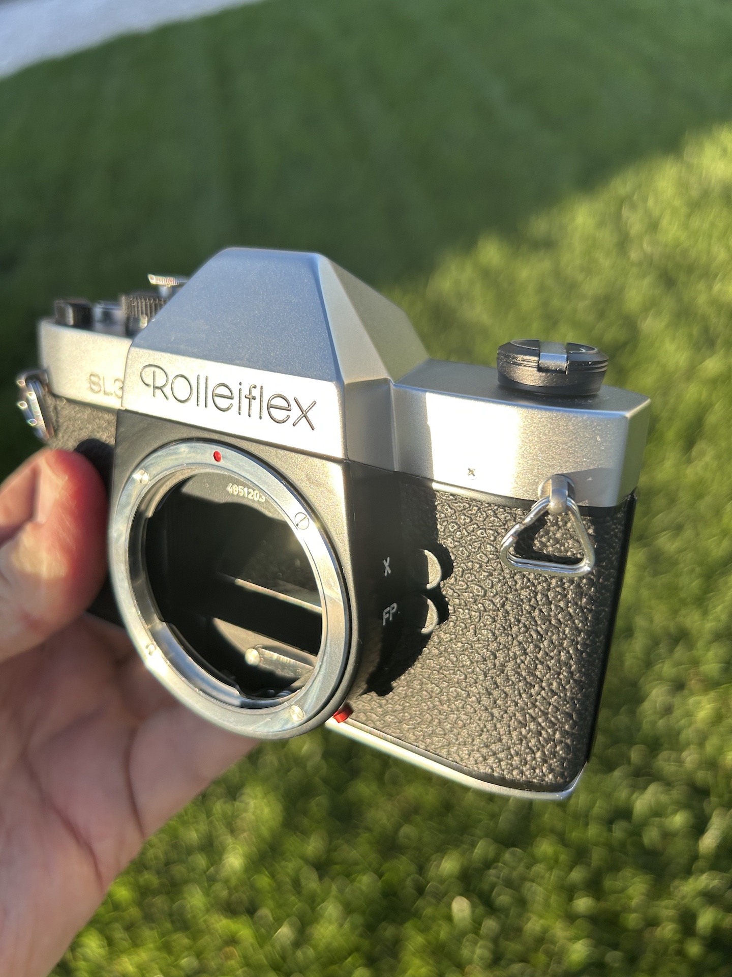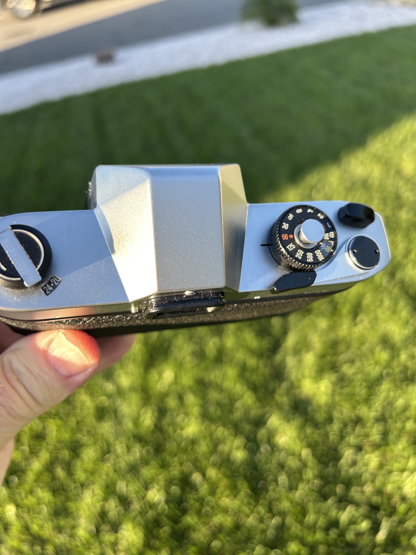 The cosmetic condition of the camera is exceptional and it has been little used (if at all). For instance, both the flash plug covers are still intact and are included. This is really a a very nice compact and light SLR that feels very good in use. There were many excellent lenses made for it (QBM) mount, including some particularly amazing ones from Zeiss and Schneider.
