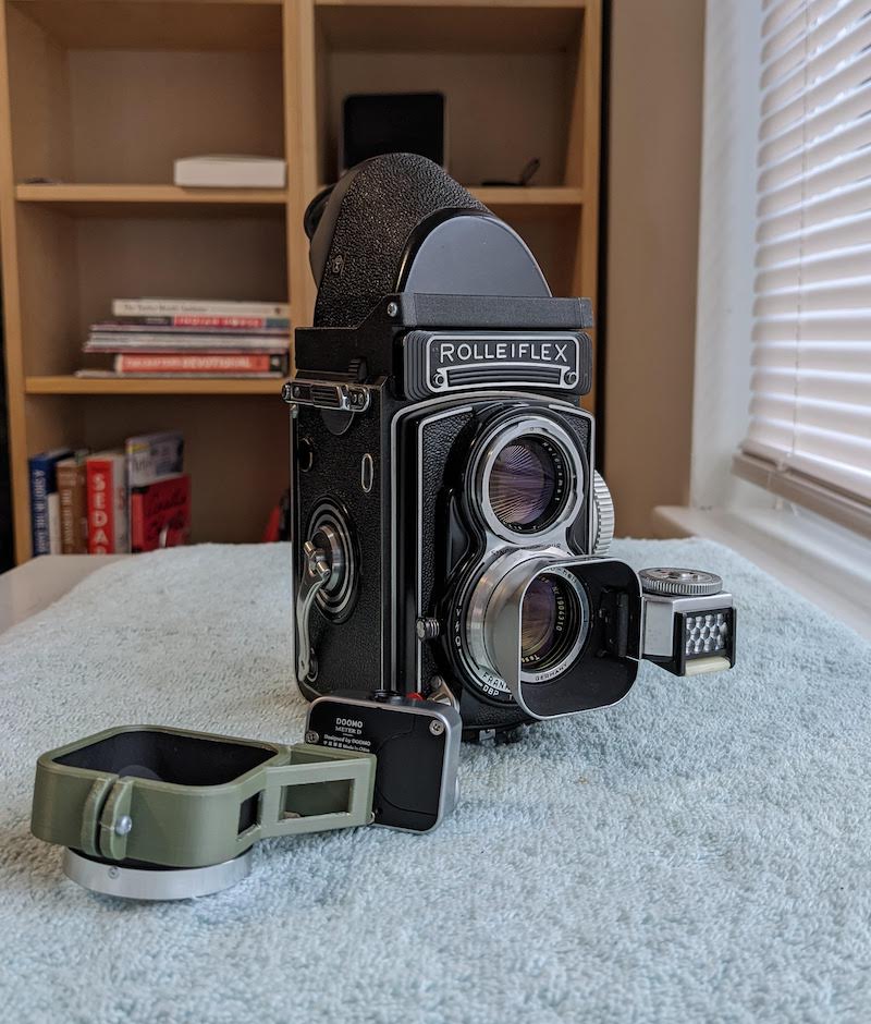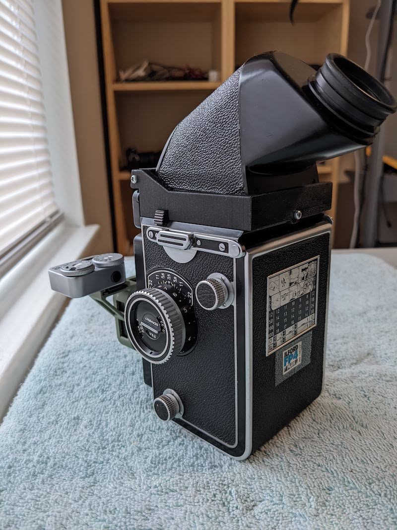 My version is larger, does not fold, and is uglier than the original, but it does fill the role that the rollielux did. It is printed in green because that's what I have at the moment. Black would look better. If you have access to I printer I recommend making some measurements and trying it. I suppose you could also mount other things on there like a small flash instead of a meter, but I don't think the bayonet mount is very robust.
