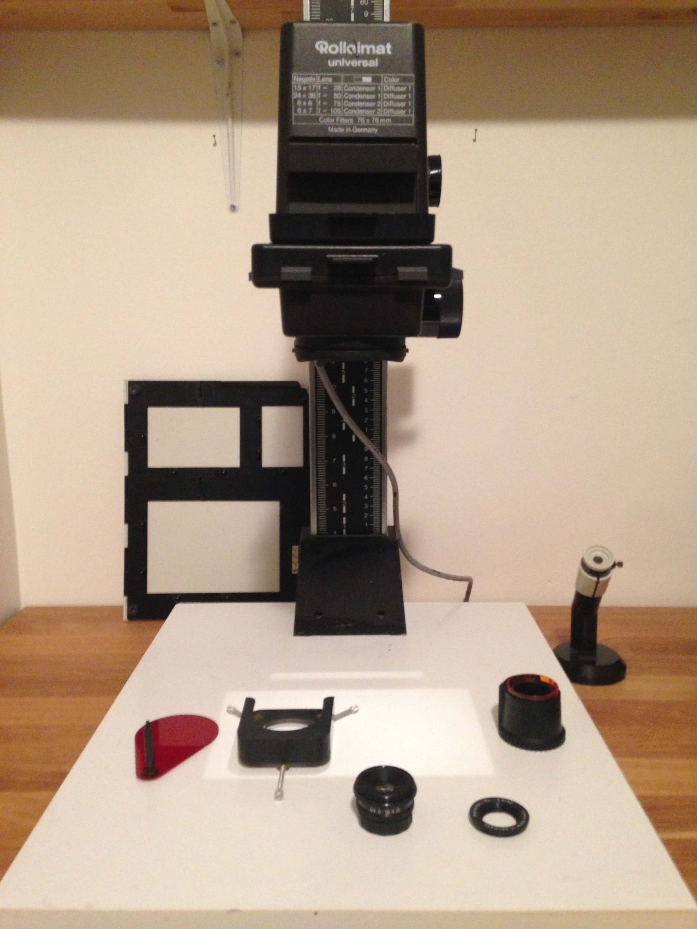 I was given a Rolleimat Universal enlarger and am trying to figure out what it is missing... I am new to film photography and have successfully printed several images using this enlarger. But as I've been reading more I learned that you can change the aperture on enlargers? This one doesn't seem to have any way to change f stop. Do I need to change the lens? Where is the lens carrier...? I have a lens I was trying to attach but see no way to do so... I'm also not sure what some of these parts are for (the black cylinder with orange plastic, there is a piece of a lens... not sure where that is from) I'm also not sure if the filter holder and red filter are even compatible with this enlarger. I can find no way to attach...
