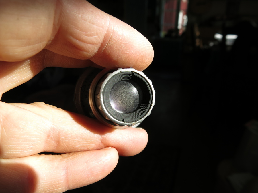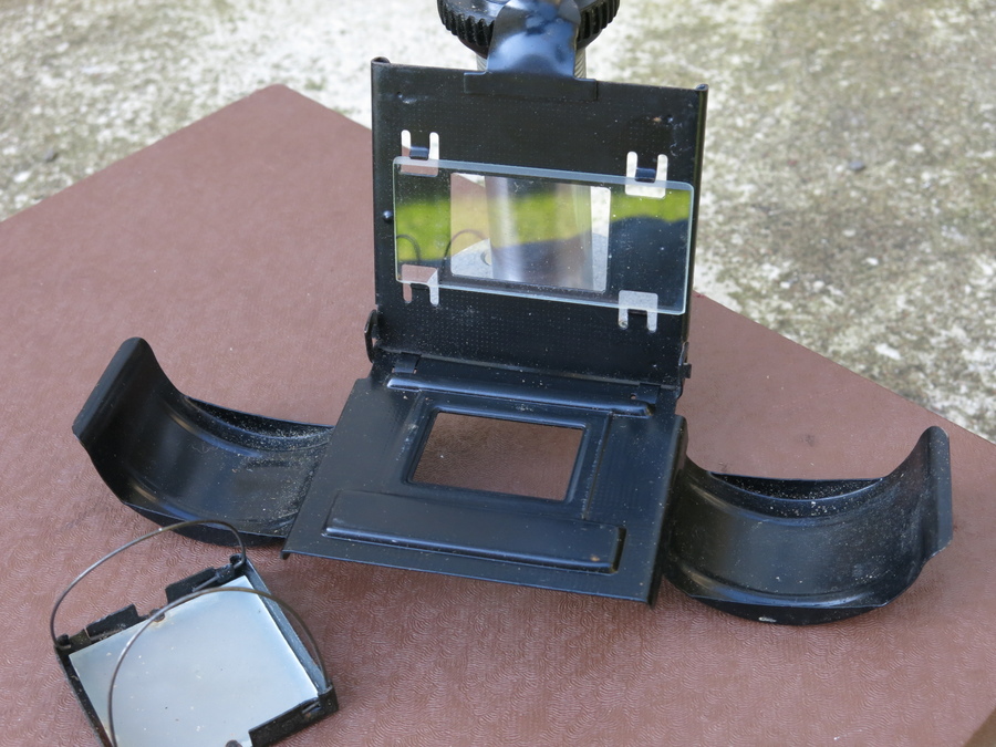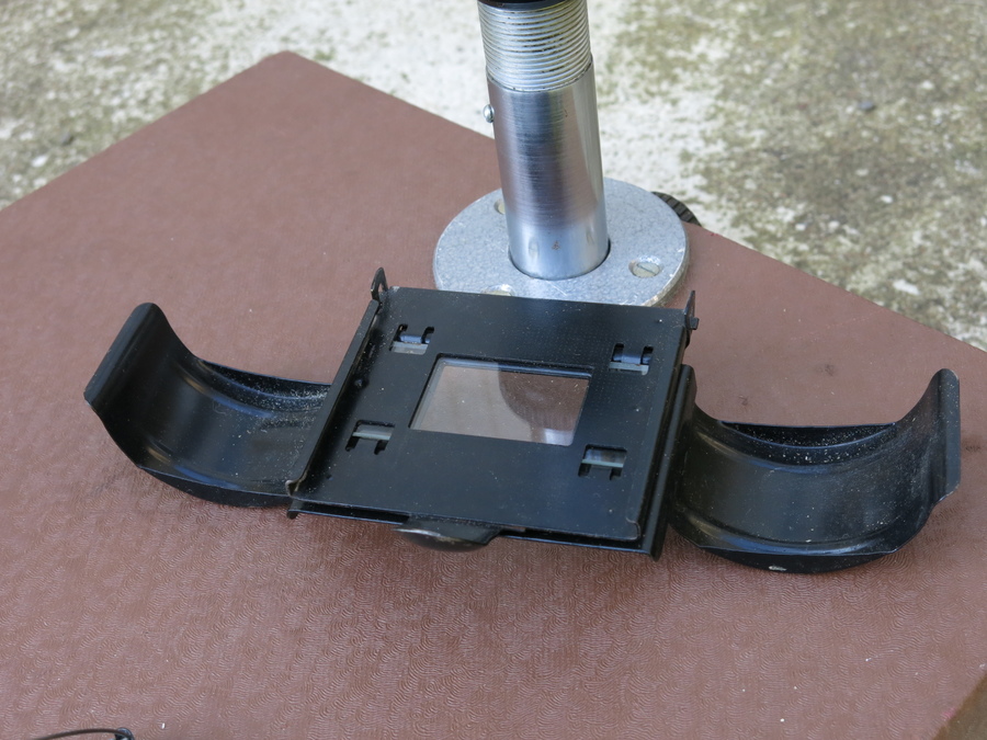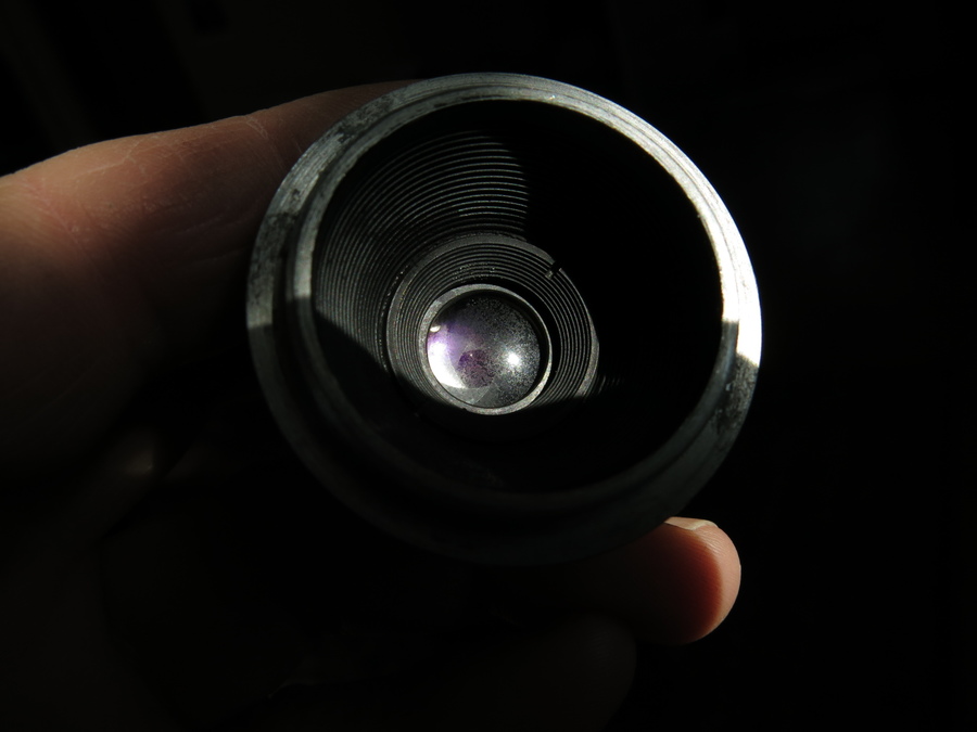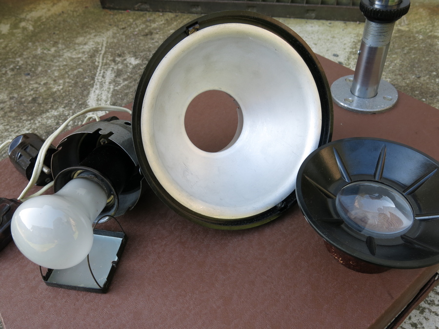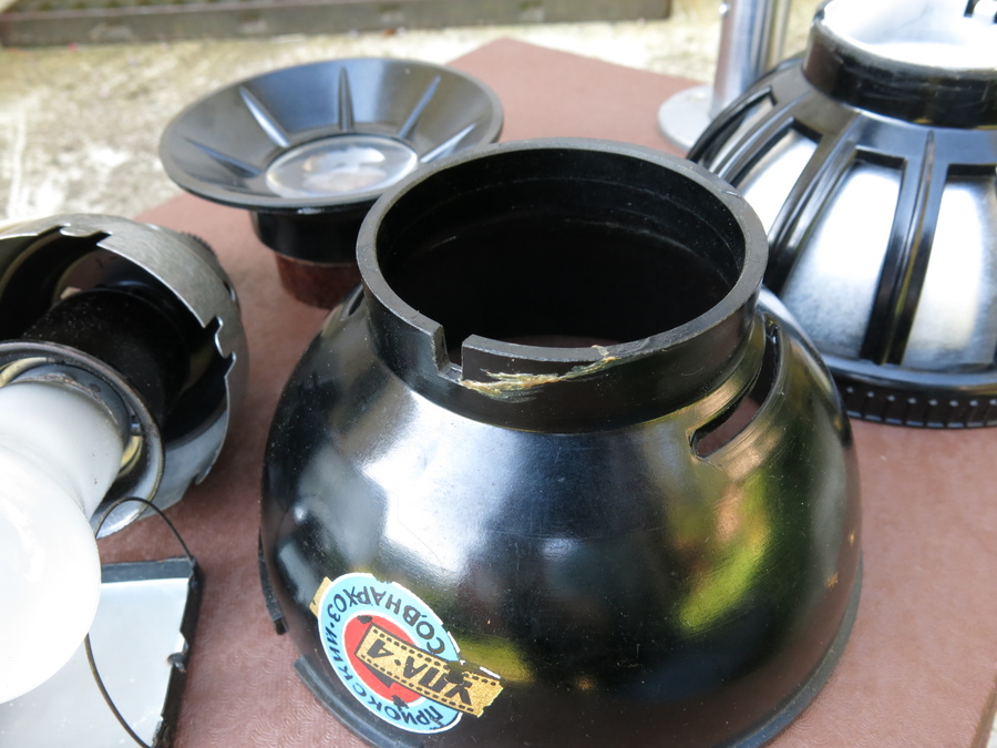 I think it is complete. There is rust on the case mountings, but I don't see any on the actual enlarger. The condenser lens is as clean as the enlarger lens is dirty! I hope an experienced person will be able to clean the lens. Aperture is smooth and blades clean, I think. The original owner may have had an issue with focus, as there was some paper placed in the screw mount of the lens: see third picture of the first post. I have not tested focus. There has been a fracture on the lamp house that is glued somewhat crude (picture below). Plug/cord/switch/lamp is OK.