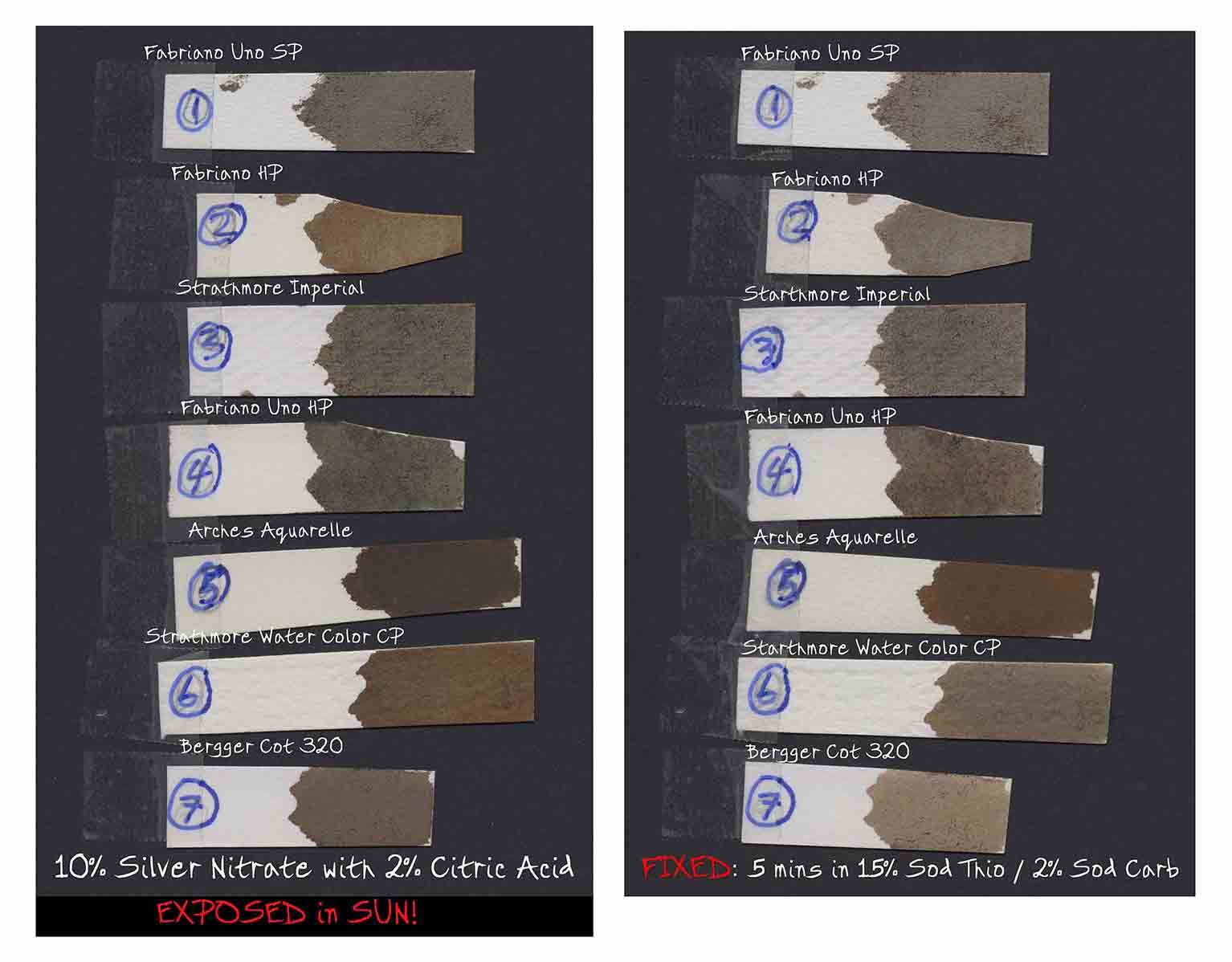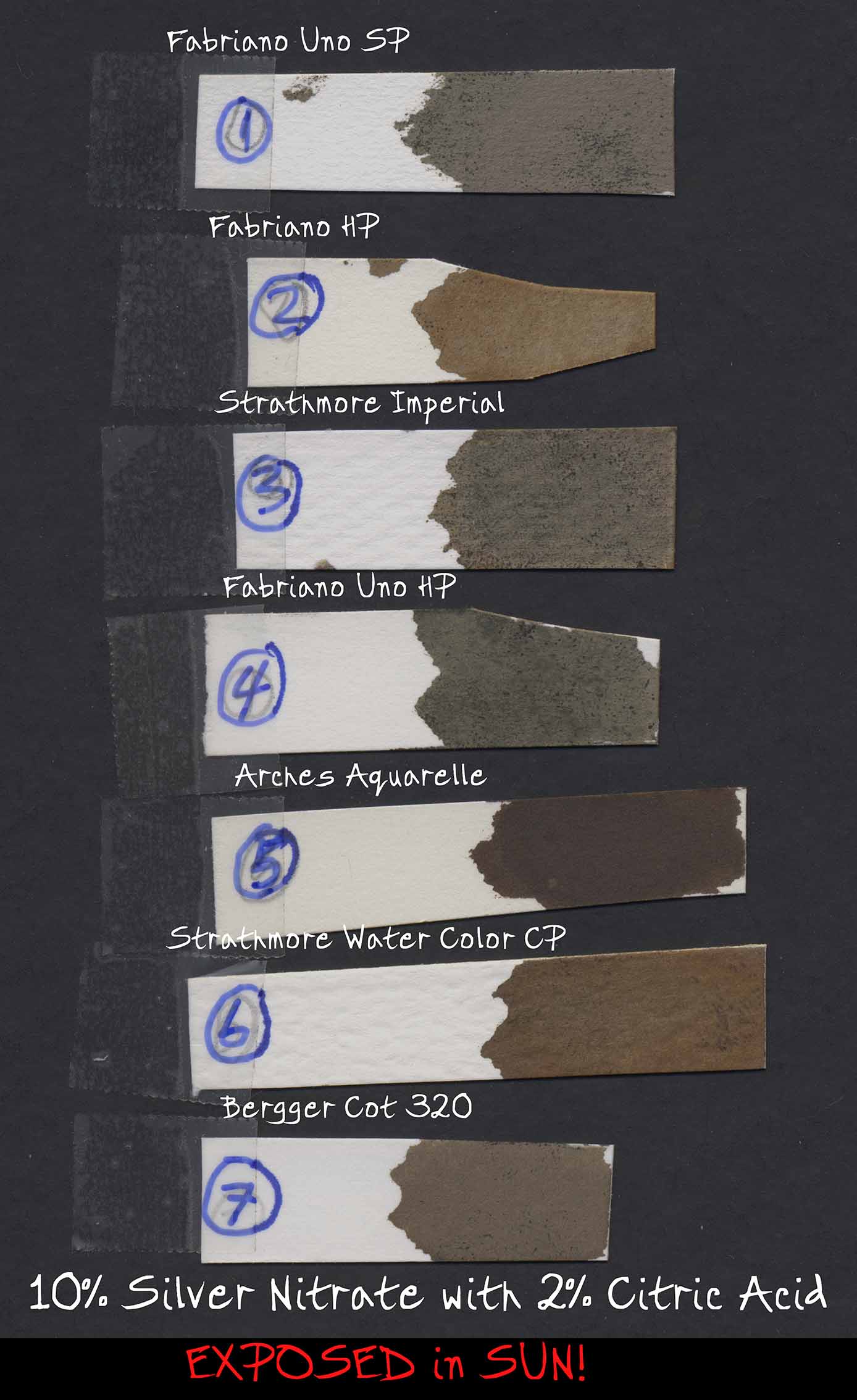 B: The above test-strips were left out in the daylight for some time and I noticed every one of them had turned significantly darker, including COT 320. So I let them sit the Sun for some more time which darkened them even more. Some of them looked like having achieved a fully exposed Dmax - particularly the Arches Aquarelle (which had second least “dark stain” after Cot 320) turned darkest of them all to a deep red. Sure looks like a candidate for salt-free (diet) printing.