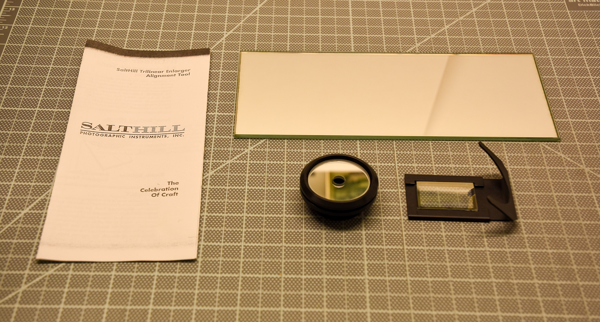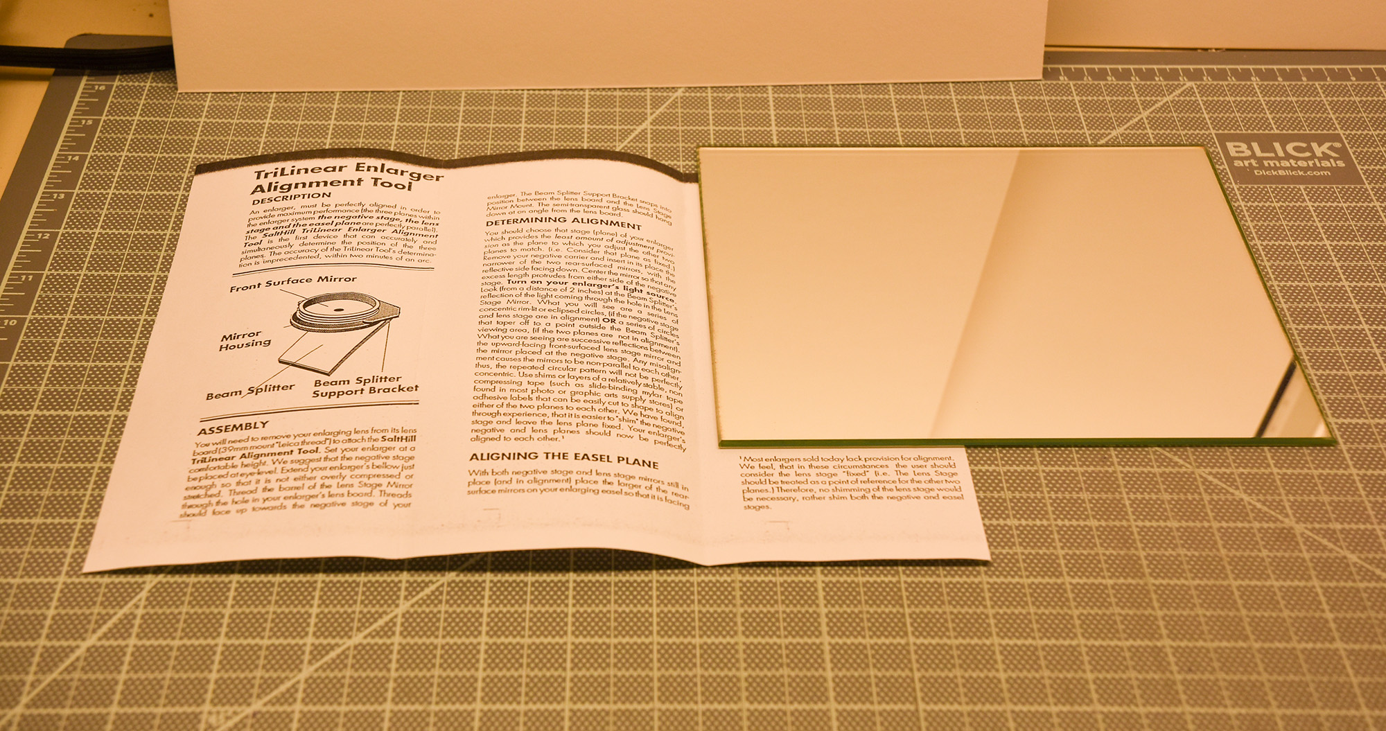 Salthill alignment tool. Two mirrors, beam splitter, beam splitter holder. Original box, original instructions, Salthill enlarger promotion.
