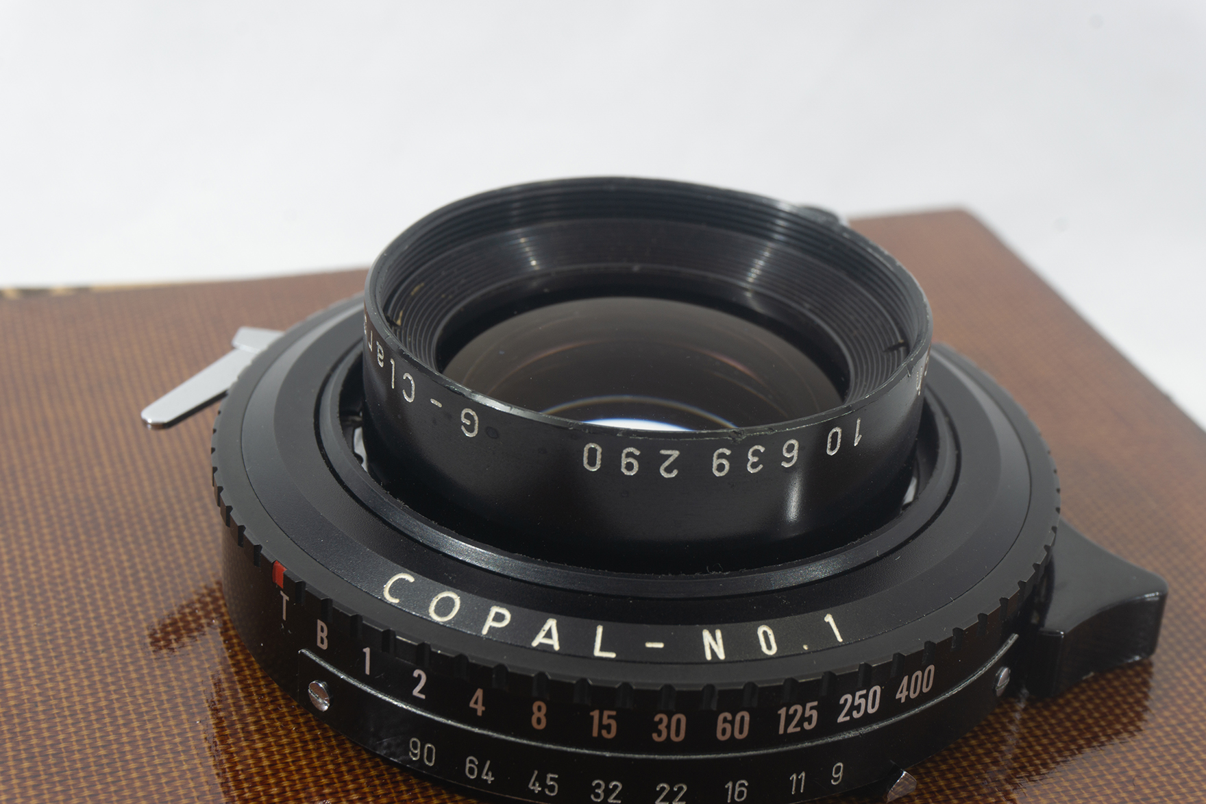 Lens is mounted on a square lens board approximately 5 1/4" wide--not entirely sure what board this is, maybe a Wisner?