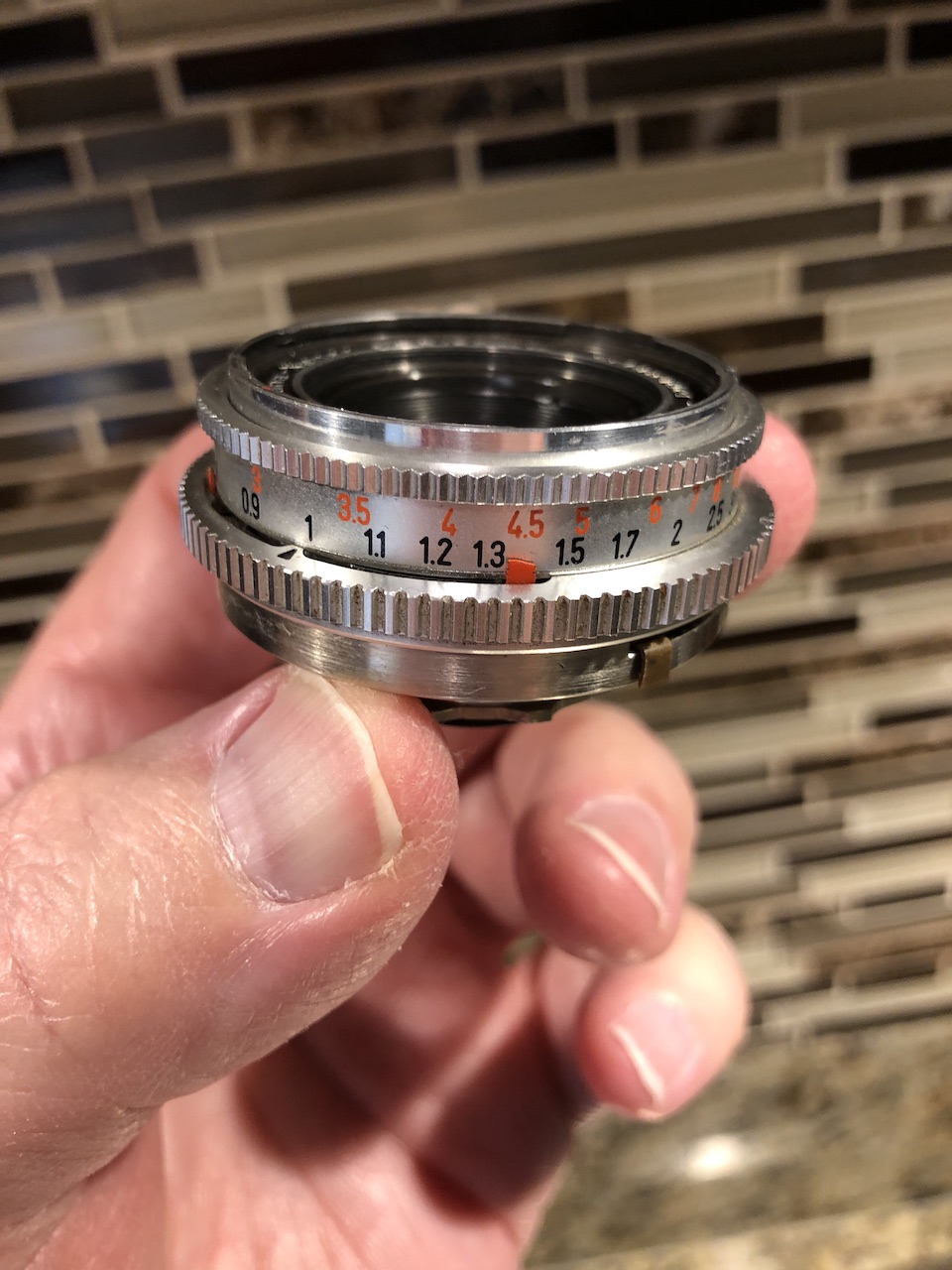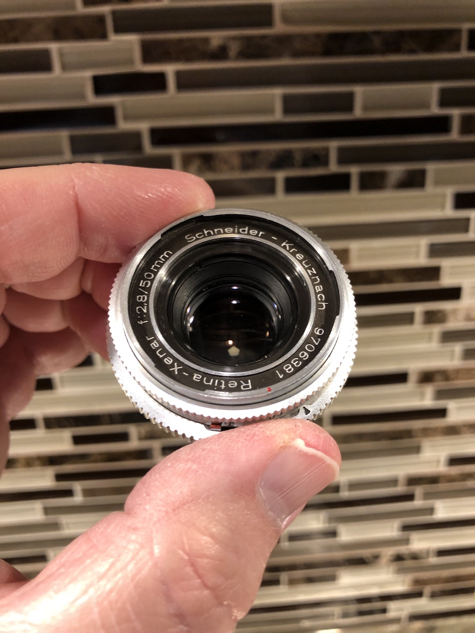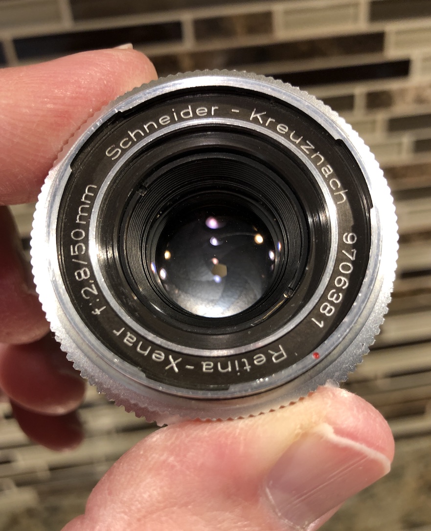 I am selling a Schneider-Kreuznach Retina Xenon 50mm F2.8 for Retina Reflex in good condition. This is a very high quality German-made lens for the Retina Reflex Series of 35mm SLR's (DKL mount). This lens has clean, clear glass with only a countable number of tiny dust specks evident (some probably external). The lens does have a very faint engraving on the back (see photos) which I can't really make out, but I suspect might have been made during manufacture possibly to keep track of personnel or parts during assembly. I only noticed this during examination under bright light (oddly I've seen such markings on 50's era German lenses before).