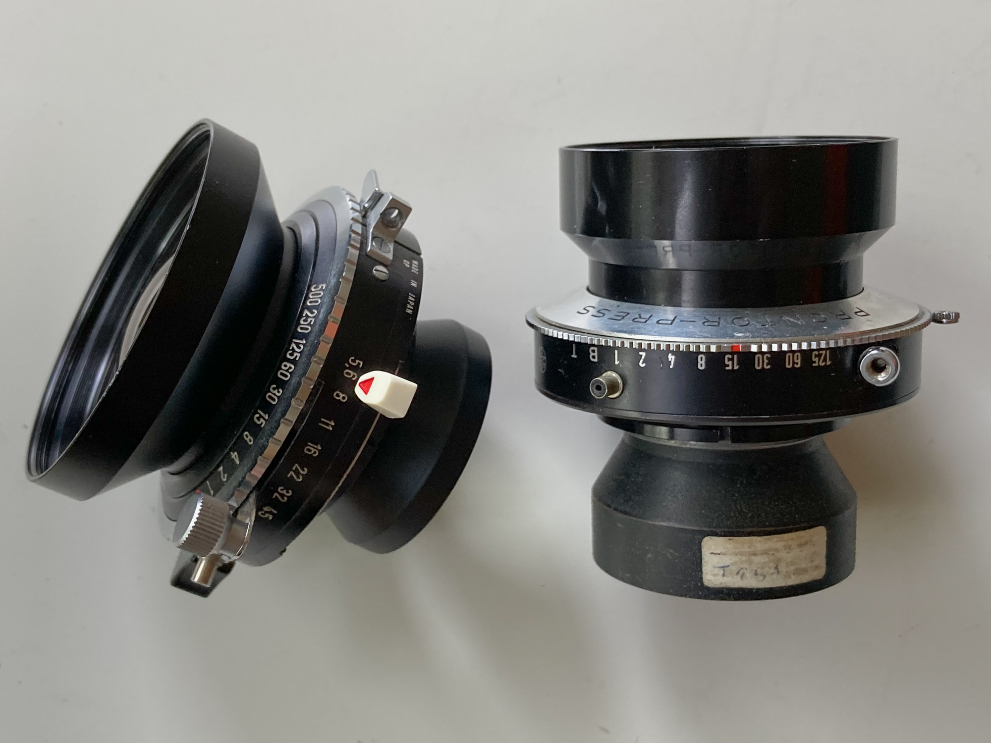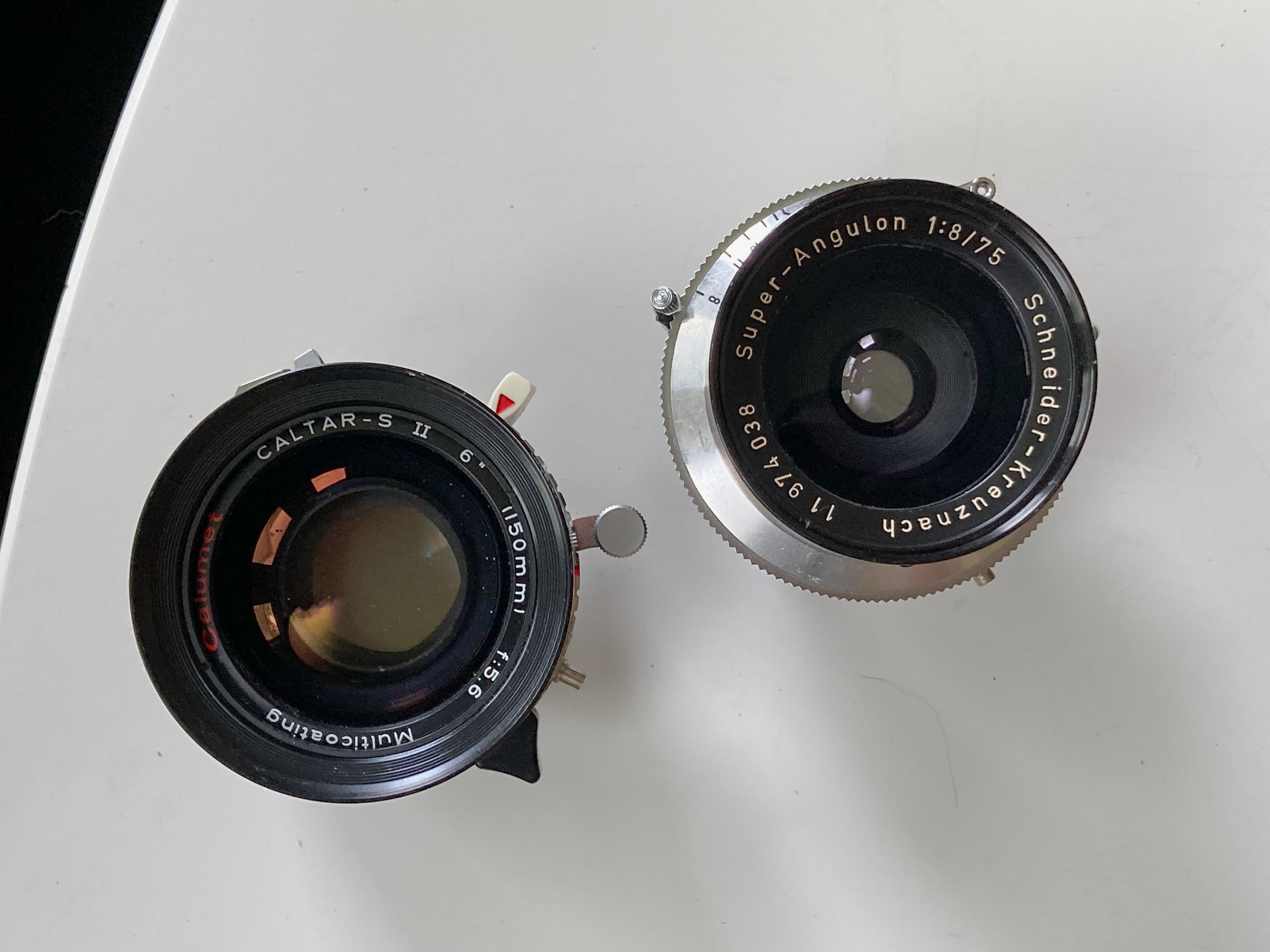 Schneider Super Angulon 75/8: in a Prontor Press (copal 0 size) self-cocking shutter, times sound good to the ear. Almost no Schneider-itis inside the lens barrel, clean glass otherwise, tiny bit of dust. Includes front cap. $250