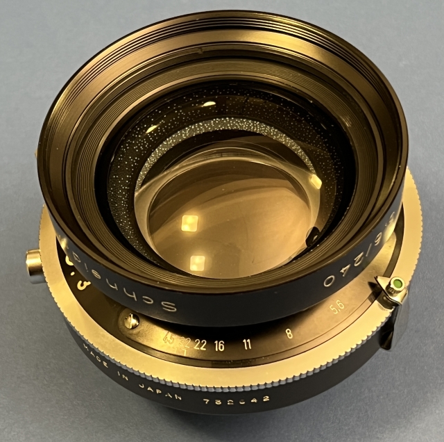 This single-coated lens is in very good condition with the usual Schneideritis. There are no dents or dings of consequence save for a scratch on the mount spacer and the glass is clean and clear with no obvious defects, certainly nothing that'll affect your images. Schneider says it'll cover 337mm at f/22 so it offers a tad of movement for what amounts to a modest wide-angle on 8x10. The shutter works and sounds appropriate on all speeds. It includes both parts of the mounting ring and seemingly original caps. This is a substantial lens, weighing 895 grams and accepting 86mm filters.