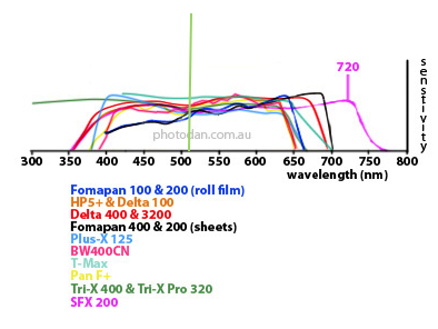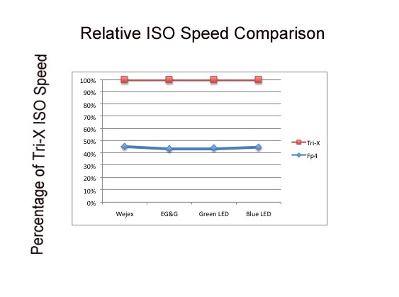 BLUE/GREEN senstiometers work just fine for comparing conventional photography film in a conventional darkroom. Green sensitometer peak indicated by the green line.