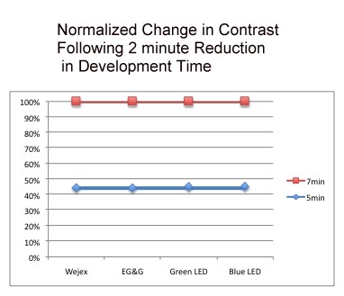It would take five test exposures for each film/developer combination to work up the data to create a usable time-CI curve.