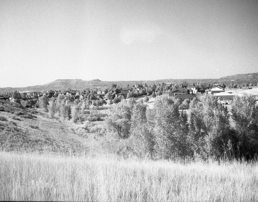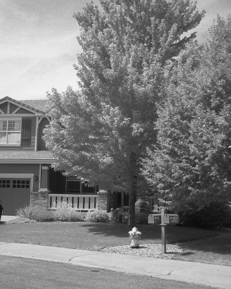 For 35mm, I almost always use manual focus lenses, because most of them have IR focus markings on them. Just compose, focus, meter, then apply the filter, reset your focal point to the IR mark, and set your camera to the compensated meter reading from before. Then take one shot above and below your calculated exposure. But if it’s clear and sunny at noon, usually ISO 12 gets me a good enough exposure to work with. It’s more forgiving to slightly overexpose than underexpose IR film.