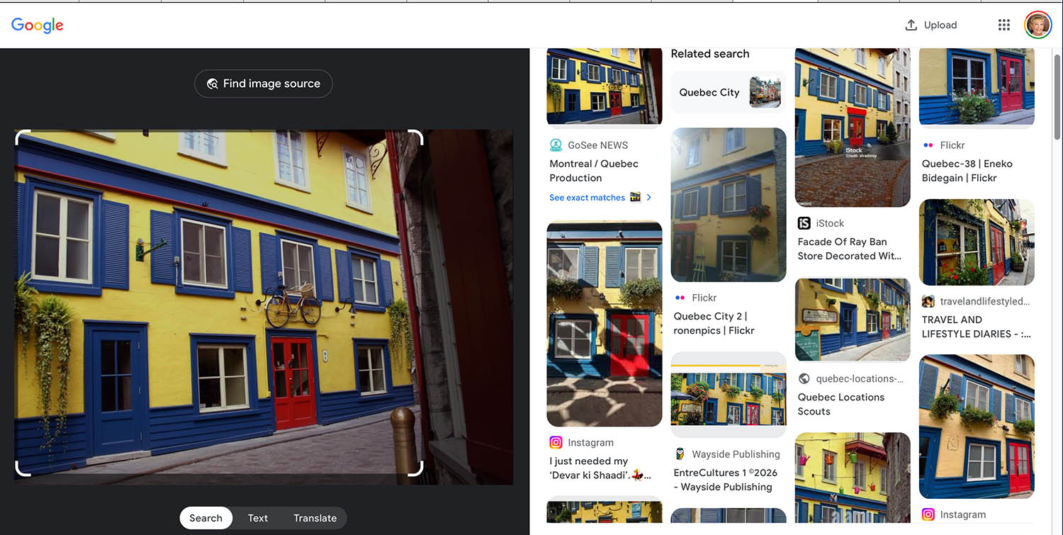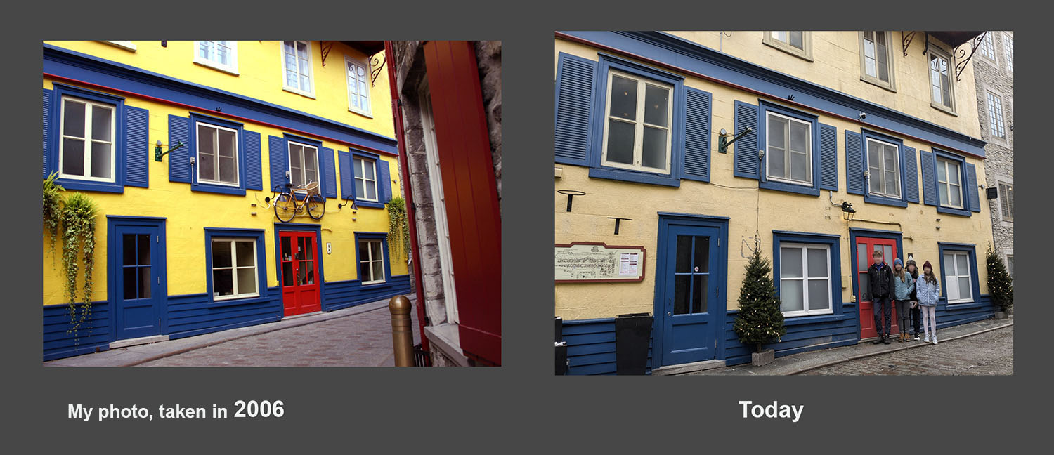 Background (if interested): The photo is from a 2006 trip to Quebec City and has been on my websites ever since. My kids and grandkids were just there last week and I asked them to find the spot, for fun, and take a picture. They did and it looks very different now. (See photos). I did an image search and a number of photos came up, including mine (the one that is posted on the business website here, scroll down.) There was only one other photo that had the bicycle in the search, which does not appear in the source website. So all in all, my photo is proving to be almost rare, at least on the web in an image search.