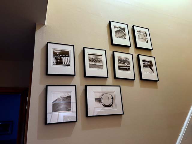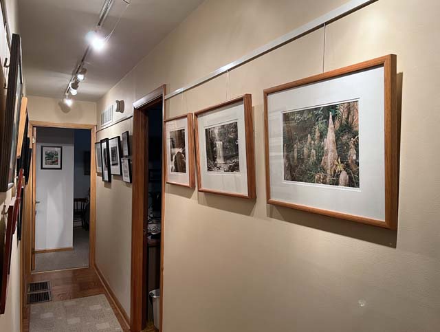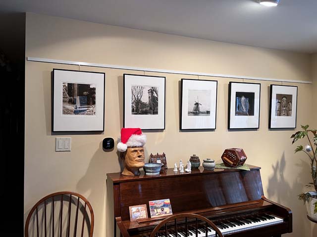 At home, one wall of the dining room (which is open to the living room), followed by a hallway which is too narrow to be ideal, but it's what we have. A couple of details from the hallway, followed by a shot of the attic stairway wall which has an array of mostly 5"x5" prints in 8x10 frames. Hanging is using stuff from AS Hanging Systems.
