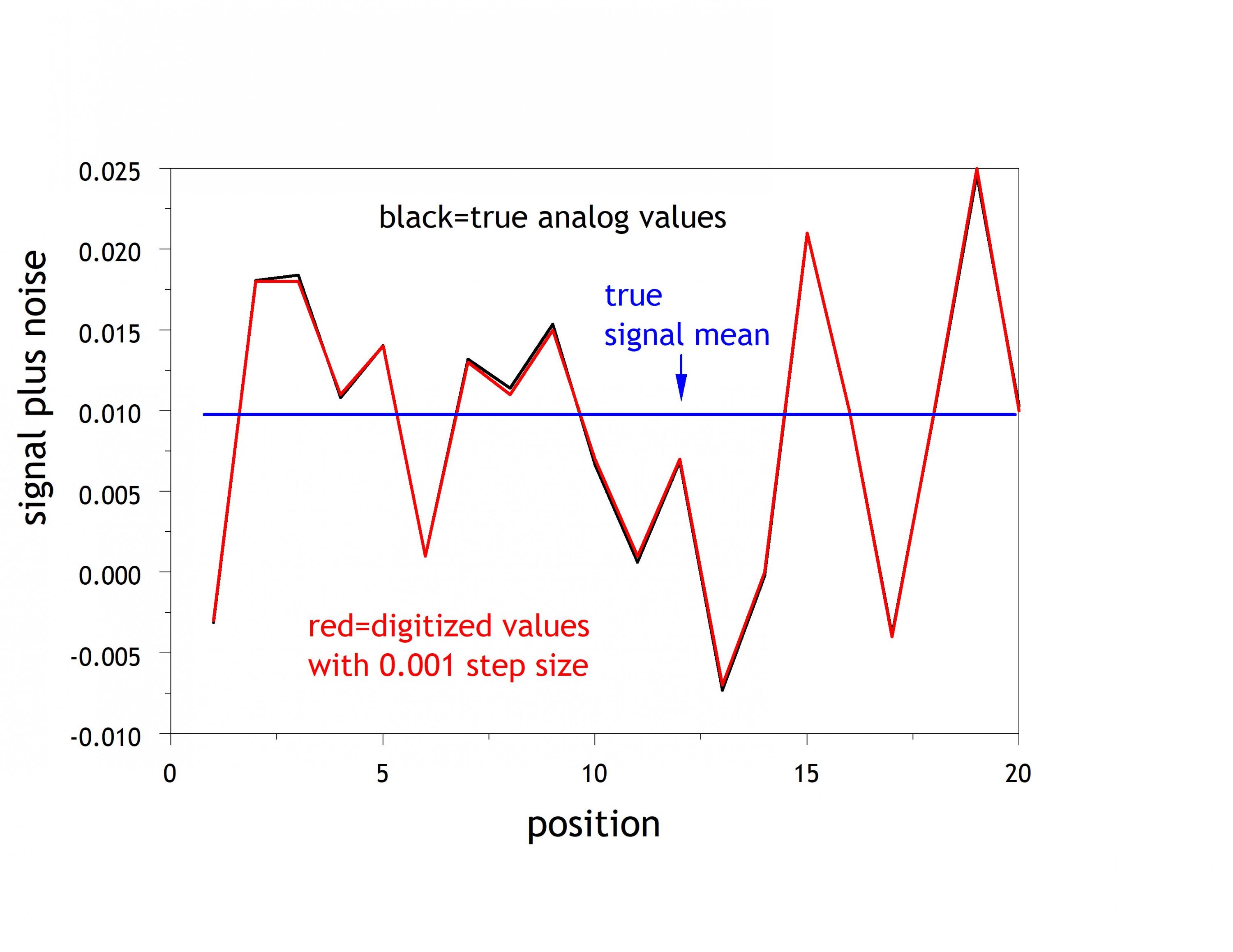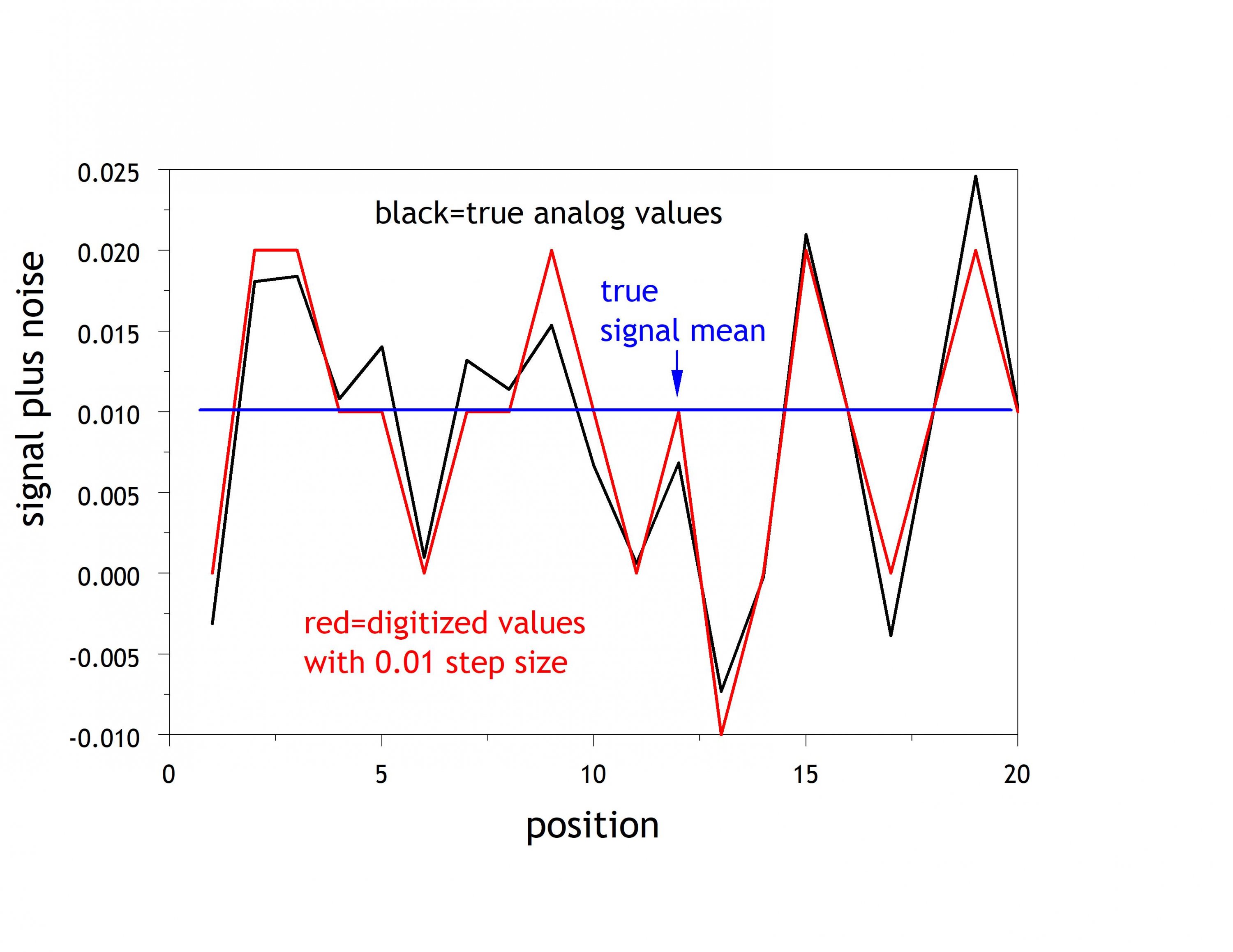 I illustrate this with a couple of figures below simulating the following cases: 1) The signal is 0.01, the standard deviation of the noise is 0.01, and the ADC step size = 0.01 and 2) The same signal and noise but with the ADC step size = 0.01. Going to a ten times smaller ADC step size bought very little useful improvement, and going to an even smaller ADC step size would buy us virtually no useful improvement.