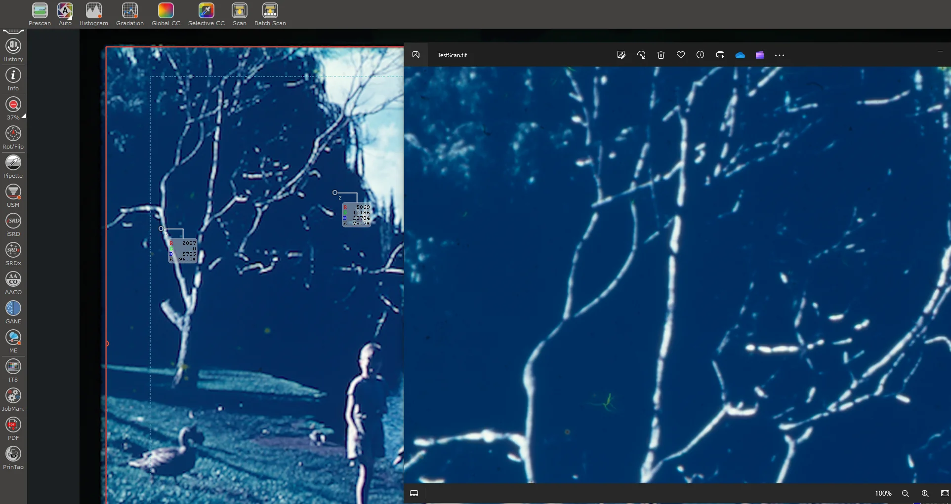 On the left is a prescan image. You can see the darker ringing where the white tree meets the darker BG. You can also see a sampler on the left of the image, labelled with a B. This is the point where the Silverfast automatic blackpoint picked. It has clearly picked a position with the BLACK ringing.
