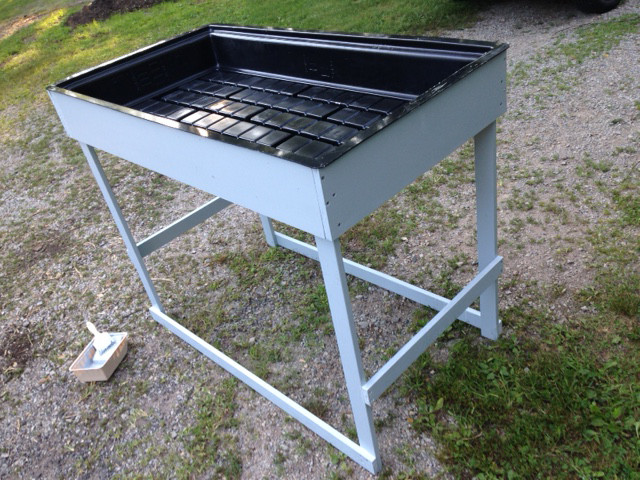 While attempting to find a cheap 2 x 4 darkroom sink i happened onto hydroponic flood tables while searching the net. I got mine from Zen Hydro. There are other suppliers. I'm using one of their drain kits (less than 5 bucks) but you could probably find something else too. The frame is pine and a simple build. There is a stepped edge so you can put some cross pieces in and put three 16 x 20 trays in, 2 below and one above. I plan on making a full size insert so I can also use it as a work table for matting etc...I was a little worried about the grid floor but it drains easily so should be ok. I built to to elbow height so i can see what I'm doing better without leaning over. I still need to make the two shelves that go down below. BTW one qt of paint won't cover the frame and shelves with two coats. I lucked out b/c my new darkroom was a laundry room at one point so all the plumbing is already there. $70 bucks including shipping across the country plus the wood and screws, paint, donuts, coffee, so much coffee etc...