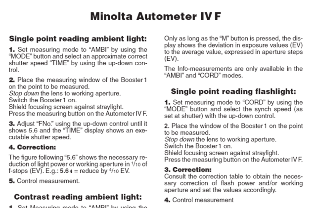 About the 5.6 thing: that really is how the Booster / Minolta work together. You take your reading, and as long as the ISO is set correctly and the Minolta is set to the f5.6, it will tell you the correct shutter speed to whatever aperture you're stopped down to. On the Auto Meter you need to manually dial the aperture setting back to 5.6 to read the shutter time, on the Flash Meter IV it tells you directly as it has f priority mode.