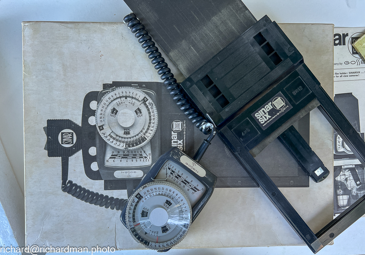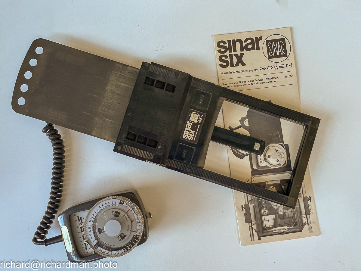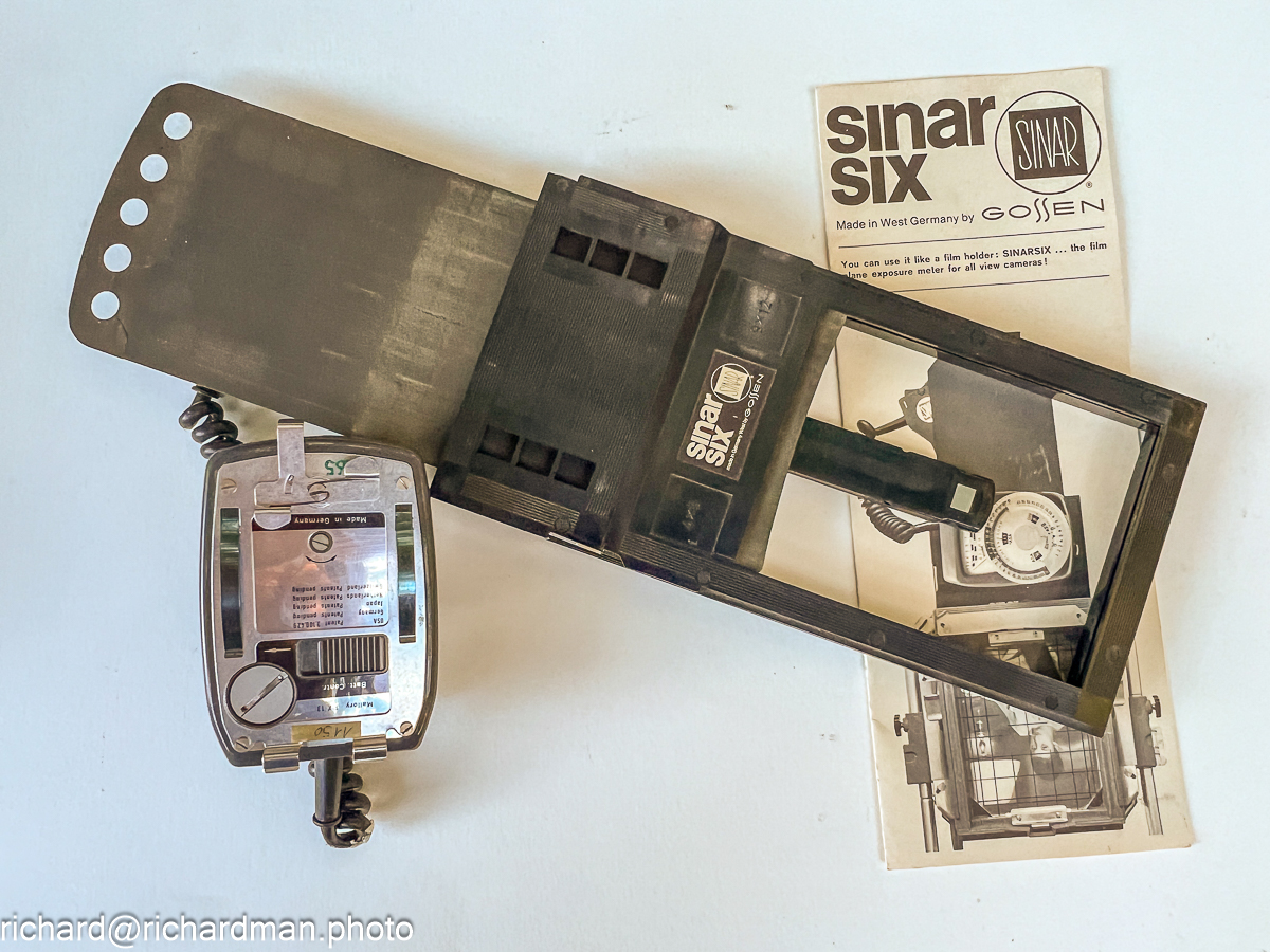 Sinar Six light meter. This measures light on your ground glass so it's super accurate. Works with 4x5 and larger format with adapters (not included). Complete with box and manual. $200 USA shipping included. Just one is available. Uses 1.5V Mercury cells (adapter available).