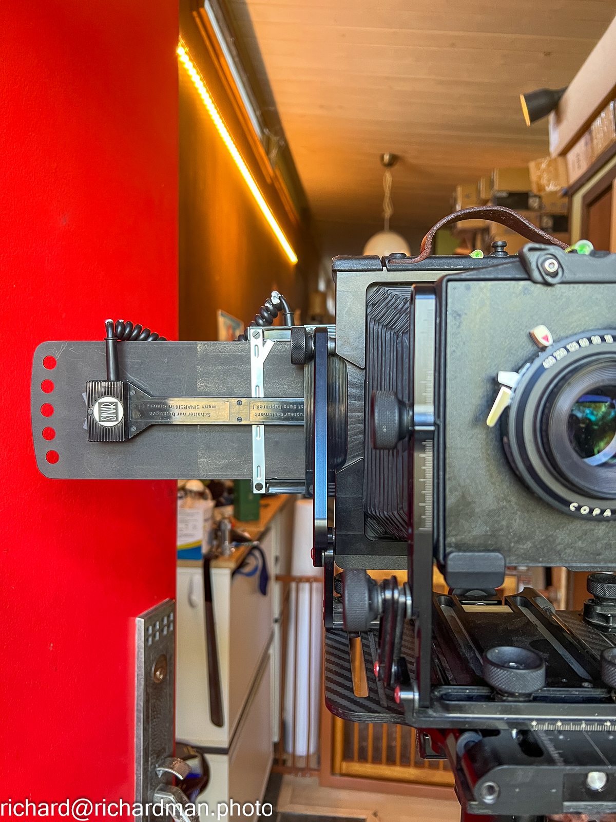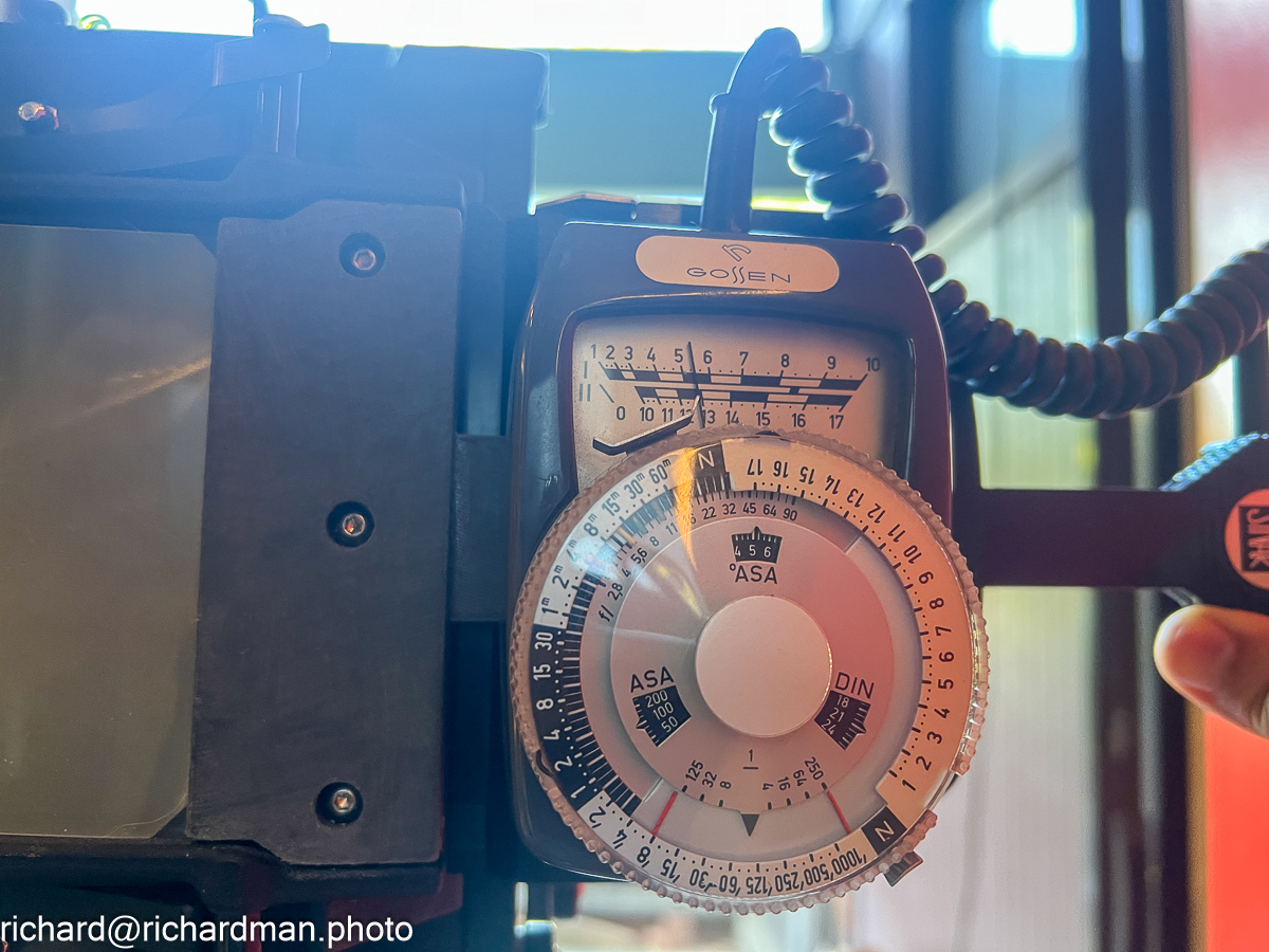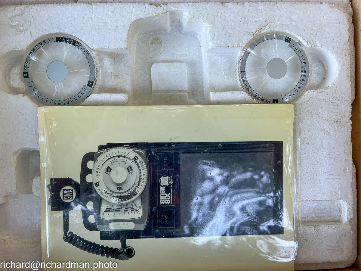 Sinar Six light meter. This measures light on your ground glass so it's super accurate. Works with 4x5 and larger format with adapters (not included). Complete with box and manual. $200 USA shipping included. Just one is available. Uses 1.5V Mercury cells (adapter available).