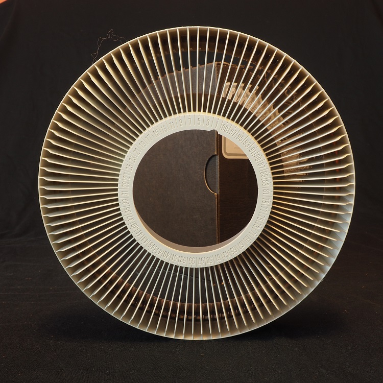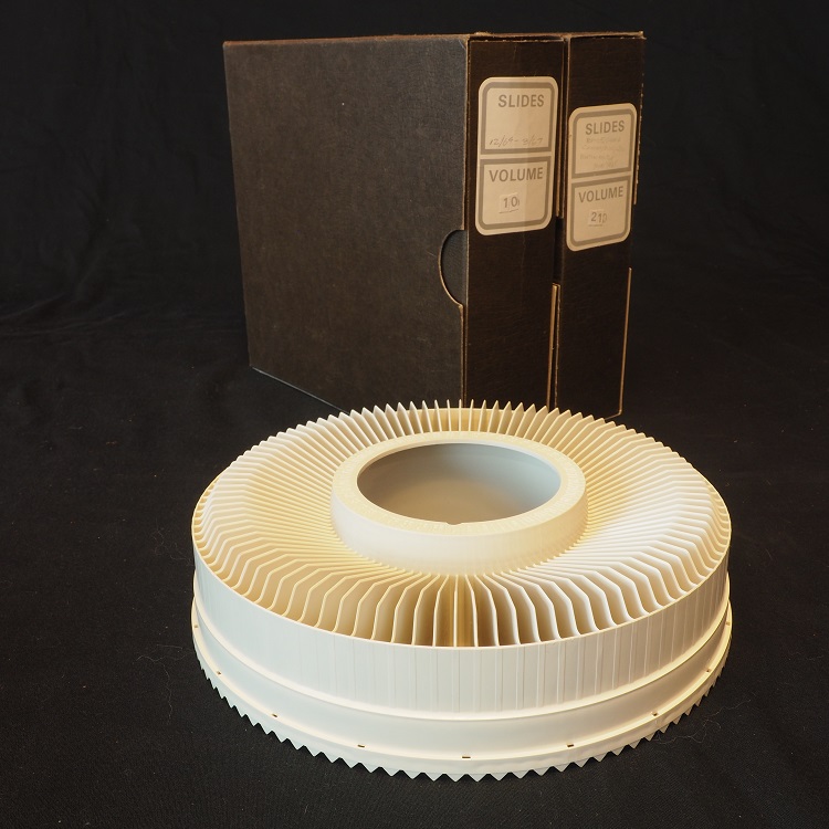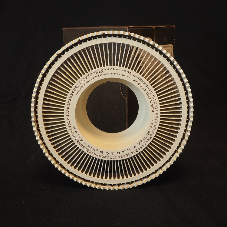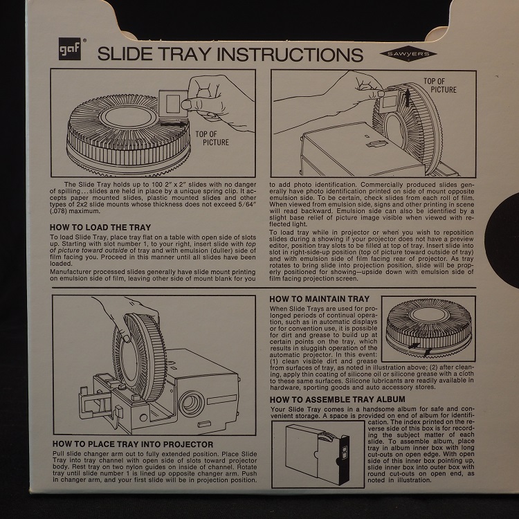 GAF Sawyer's 100 Slide Projector Rototray Carousel Tray & Boxes, Rotary tray for 2"X2" 35mm film slides. These are used, the boxes have writing on them, you can cover that with your own labels. The boxes all look similar but some of them don't have the instructions or slide list on the inner box. Some of the carousels are white, black and translucent, let me know if you have a preference and I will see what I can do to accommodate that. So far most are white, I still have several boxes to go through. I'm in the process of going through my fathers slides so I will be adding to the quantity as I empty more boxes. I'm re-boxing my father's slides so they take up less space. Each tray is in good working condition having been tested by me with my fathers old Sawyers projector. These trays will work in the following types of projectors as long as they can accommodate the rotary carousel: