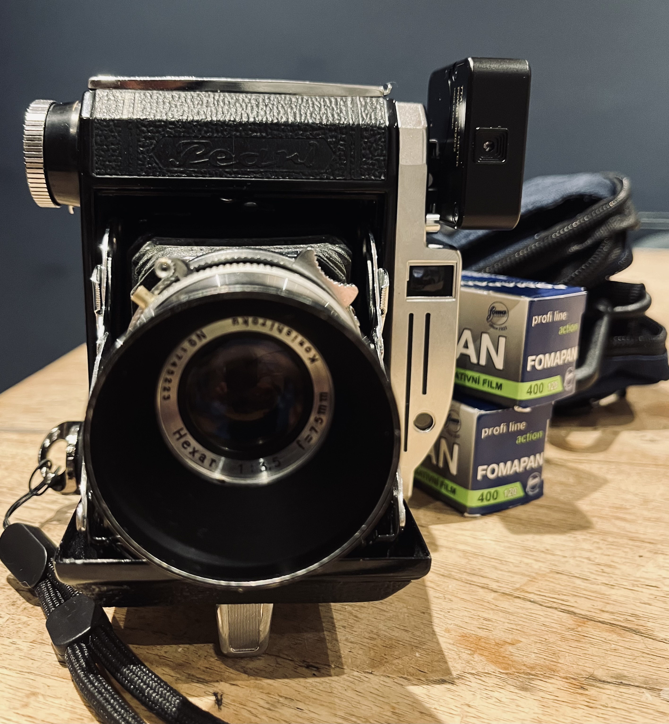 I have recently invested in a Konica Pearl iii 645 folder, and fitted it with a small shoe meter and a push-on hood. I now have the smallest medium format setup I have ever used. A Perfect street shooter.