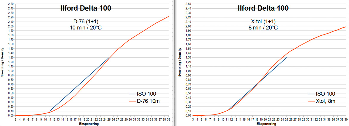 Xtol 1+1 and Delta 100 seem to cause quite serious highlight roll-off if you start to push your exposure up the scale - I've attached screenshots of the comparator curves available here. There are caveats - I recall finding some of the Fotoimport results have been developed for slightly wayward times etc, but they do give a useful snapshot. The other point is that as you extend development times you'll steepen the midrange and enhance the roll-off, exaggerating the results into the highlights that are already causing the muddying of details in the higher scale which you are currently dealing with. It also explains why I was a bit puzzled by the Xtol results you were getting compared to what I know Delta 100 does with D-76 and Rodinal. I would however say that my suggestion of TMax developer stands for what you are wanting to do - but that T-Max 100 and T-Max developer might together act to kick the tonal separation up a notch - again the Fotoimport results may seem a bit confusing, but if you adjust the dev time for TMax 100 so the midtones match (9-10 mins, going by Kodak's data, I reckon - see pg.8 and pg. 9), you'll get significantly stronger - even exaggerated beyond linear - highlight separation than Delta 100 and TMax developer give. It's for situations like this that TMax 100 was designed - it just requires a bit of common sense in its usage, rather than the often very casual/ outright sloppy approach people had to the exposure & processing of 100 speed films in the (now quite distant) past - TMax is older than I am!