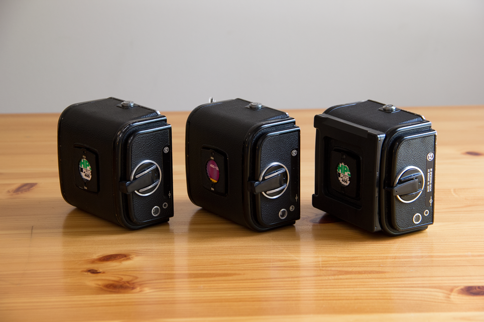- Three (3) 500C/M A12 film backs w/new light seals (one has darkslide holder but is missing winder knob. See photos for more detail)
